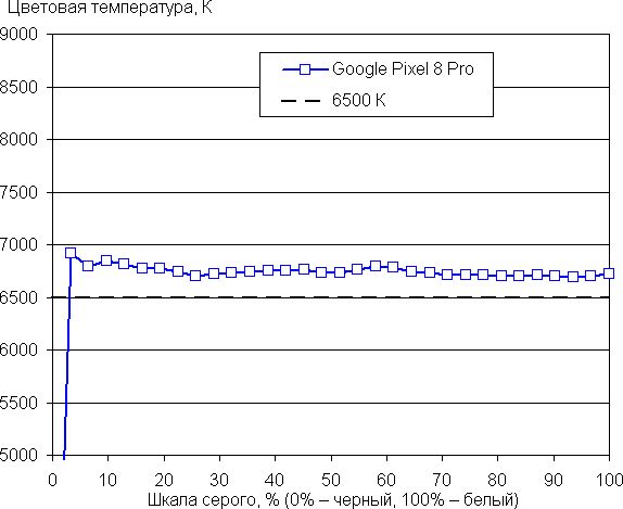 Баланс оттенков на шкале серого очень хороший, так как цветовая температура близка к стандартным 6500 К, а отклонение от спектра абсолютно черного тела (ΔE) ниже 10, что для потребительского устройства считается хорошим показателем. При этом цветовая температура и ΔE мало изменяются от оттенка к оттенку — это положительно сказывается на визуальной оценке цветового баланса. (Самые темные области шкалы серого можно не учитывать, так как там баланс цветов не имеет большого значения, да и погрешность измерений цветовых характеристик на низкой яркости большая.)