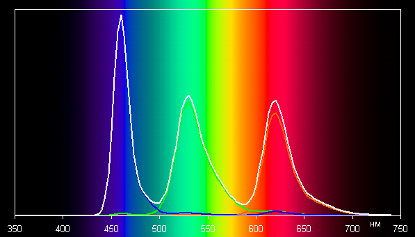 Такие спектры типичны для матриц OLED — компоненты хорошо разделены, что позволяет достигнуть широкого цветового охвата. Однако в данном случае цветовой охват аккуратно корректируется до границ sRGB. В итоге визуально цвета имеют естественную насыщенность.