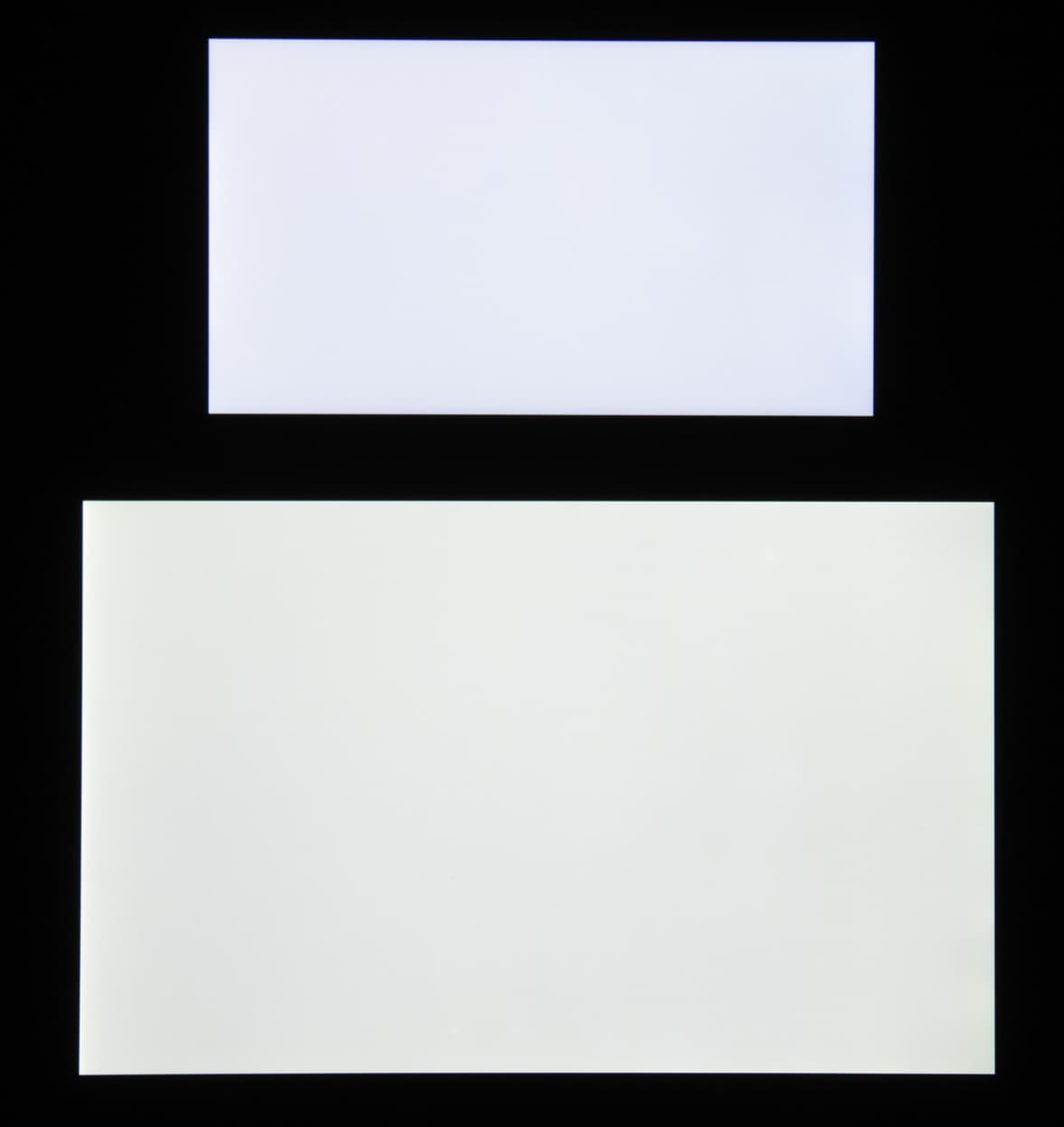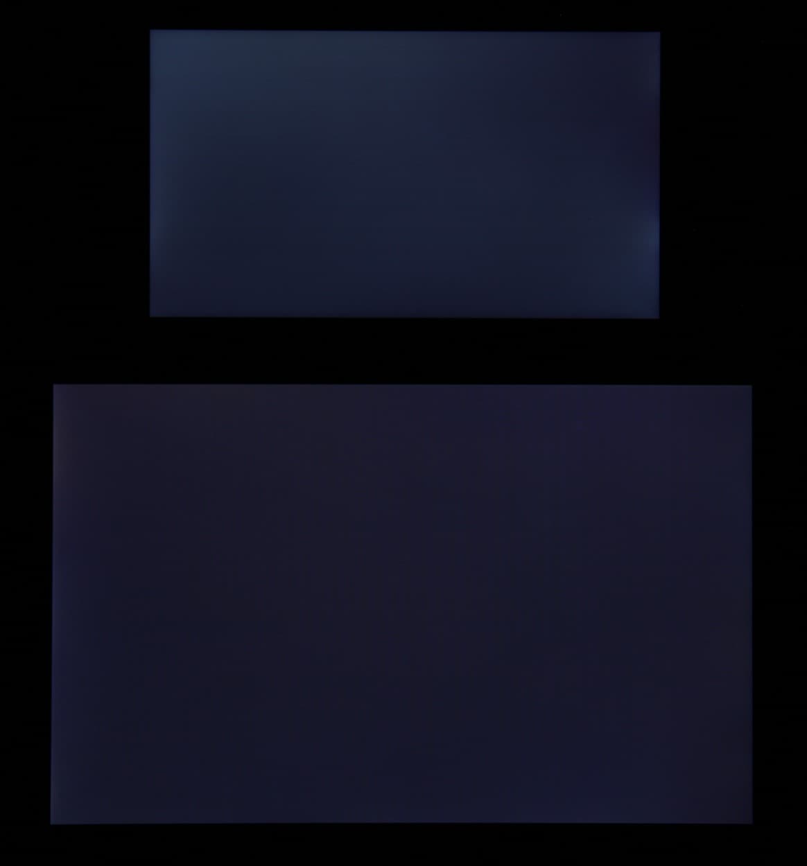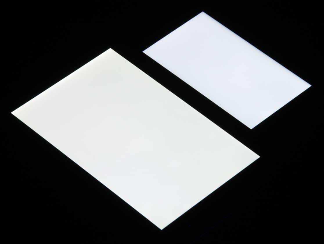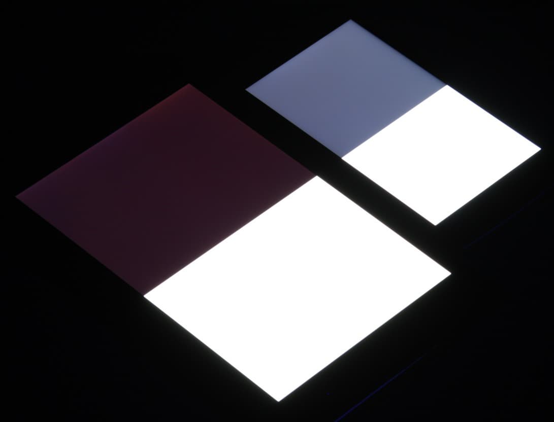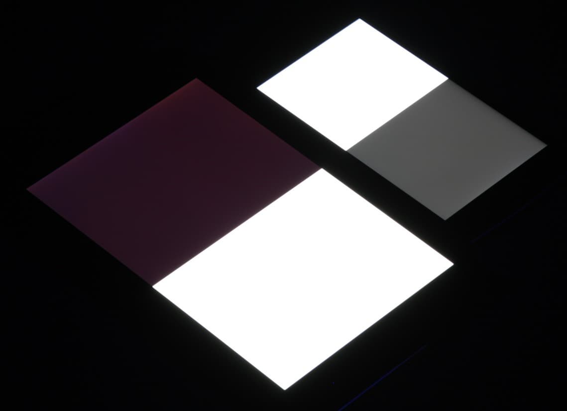 Яркость под углом у экранов уменьшилась (как минимум в 5 раз, исходя из разницы в выдержке), и уменьшилась примерно одинаково. Черное поле при отклонении по диагонали высветляется сильно, но остается условно нейтрально-серого оттенка или слегка синеет. Фотографии ниже это демонстрируют (яркость белых участков в перпендикулярном плоскости экранов направлении одинаковая!):