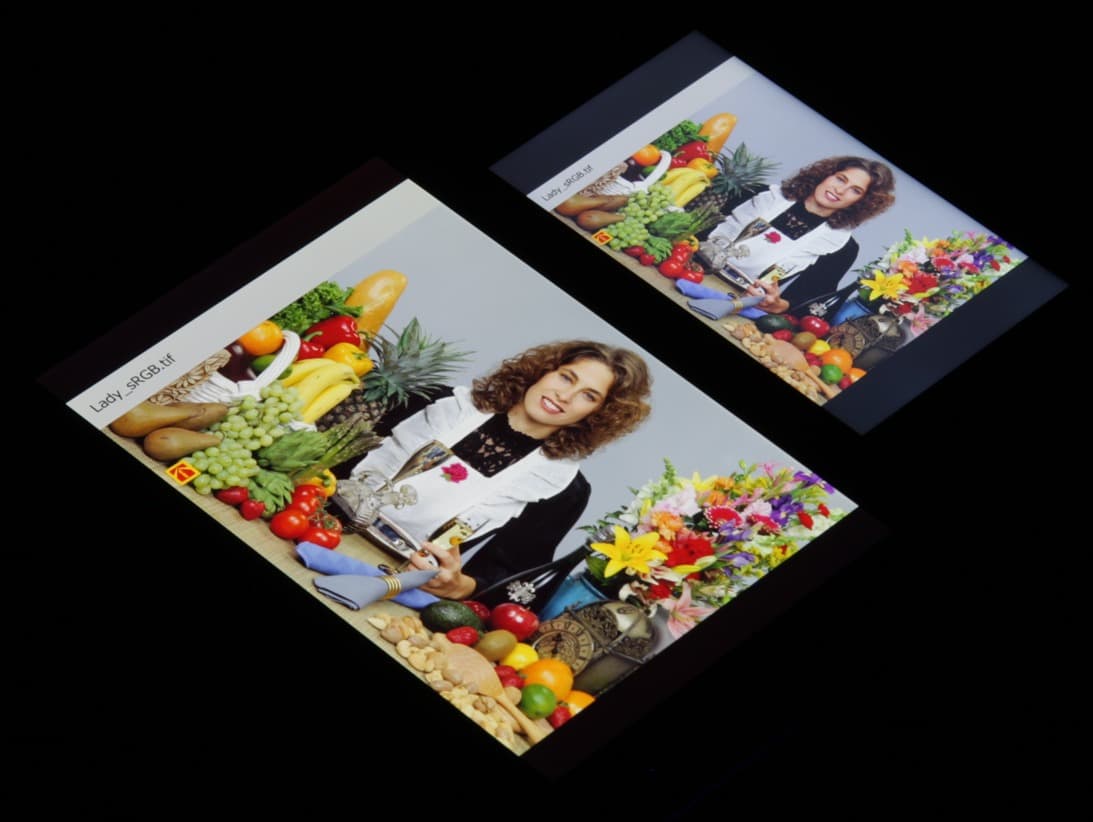 Однако отклонения координат первичных цветов от вершин треугольника sRGB небольшие, поэтому визуально цвета на этом экране практически не отличаются от естественных. Баланс оттенков на шкале серого плохой, так как цветовая температура значительно превышает стандартное значение 6500 К, но хотя бы отклонение от спектра абсолютно черного тела (ΔE) меньше 10, что для потребительского устройства считается хорошим показателем. При этом цветовая температура и ΔE мало изменяются от оттенка к оттенку — это положительно сказывается на визуальной оценке цветового баланса. (Самые темные области шкалы серого можно не учитывать, так как там баланс цветов не имеет большого значения, да и погрешность измерений цветовых характеристик на низкой яркости большая.)