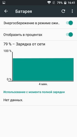 Смартфон не поддерживает быструю зарядку, комплектный сетевой адаптер полностью заряжает батарею начальным током 1,3 А при напряжении 5,2 В в течение без малого 4 часов. Беспроводная зарядка также не поддерживается.