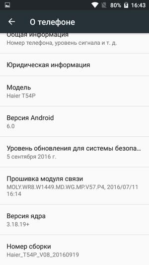 В качестве программной платформы в Haier T54P используется 32-разрядная программная платформа Google Android версии 6.0, есть возможность обновления по воздуху (ОТА). Альтернативного интерфейса тут нет, смартфон работает на чистой ОС Android с фирменным оформлением Material Design. Дополнительных программ, кроме диспетчера файлов и менеджера батареи, не установлено.