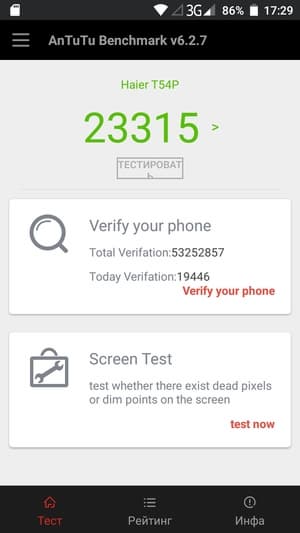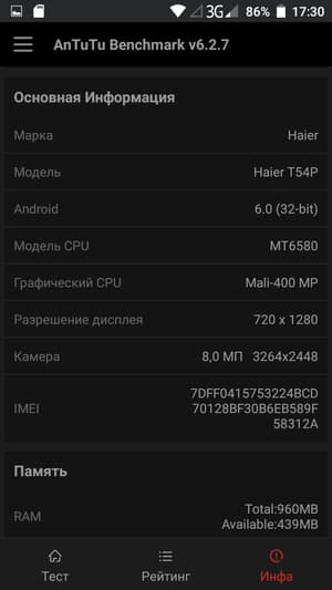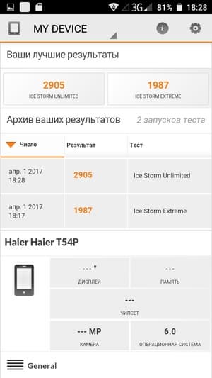 MediaTek MT6580 в Haier T54P — это дешевая платформа, старенькая, и маломощная, с отсталыми процессорными ядрами Cortex-A7, малым количеством оперативной памяти и таким же слабым видеоускорителем. Современные тесты 3DMark Ice Storm Sling Shot и GFX Benchmark смартфону просто недоступны вследствие того, что видеоускоритель не поддерживает OpenGL ES 3.1, запускаются лишь самые старые тесты, с OpenGL ES 2.0. Haier T54P пока еще справляется с основными задачами и даже позволяет поиграть в нетребовательные игры, но запаса для будущих обновлений у его аппаратной начинки нет.