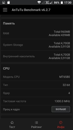 - SoC MediaTek MT6580, 4 ядра ARM Cortex-A7 @1,3 ГГц