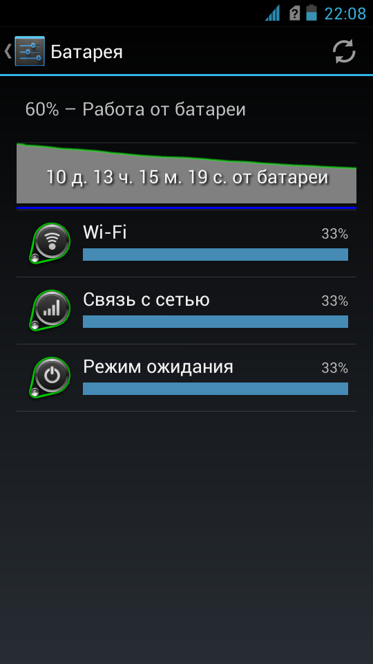 С одной стороны, данный раздел должен быть наиболее интересным для HighScreen Boost. Но с другой — всем ясно, что никаких оригинальных технических решений для увеличения времени автономной работы в устройстве нет. Производитель просто увеличил размеры корпуса и установил батарею очень высокой (для смартфонов) емкости — 4160 мА·ч. Никаких специальных режимов или настроек энергосбережения не предусмотрено. Единственное, на что можно рассчитывать — на автоматическую регулировку тактовой частоты процессорных ядер: при отсутствии нагрузки она снижается с 1,4 ГГц до 245 МГц. Так что если ваши приложения не очень активны, и телефон в основном находится в состоянии ожидания, то есть неплохие шансы получить действительно долгоиграющий аппарат.