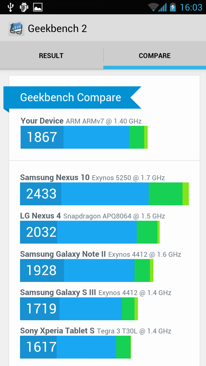 Во всех тестах герой обзора продемонстрировал схожие с Samsung Galaxy S 3 результаты, лишь немного отстав от своего более именитого собрата. Вероятно, дело и правда в более медленной флеш-памяти, об этом красноречиво говорит результат теста файловой системы в наборе Softweg Benchmark.