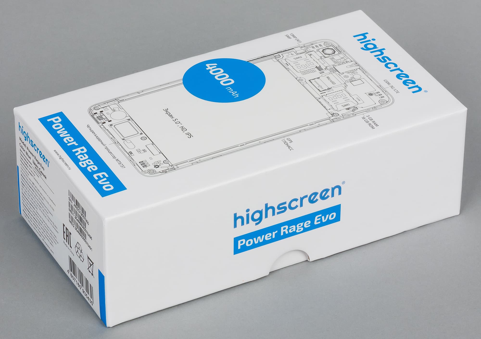 Упаковка у Highscreen Power Rage Evo простенькая, но довольно практичная: это небольшая прочная коробочка из картона.