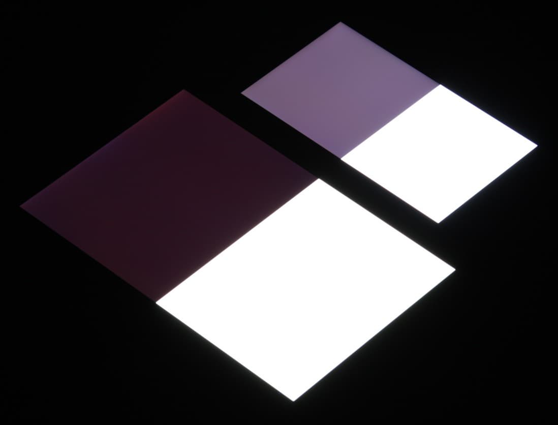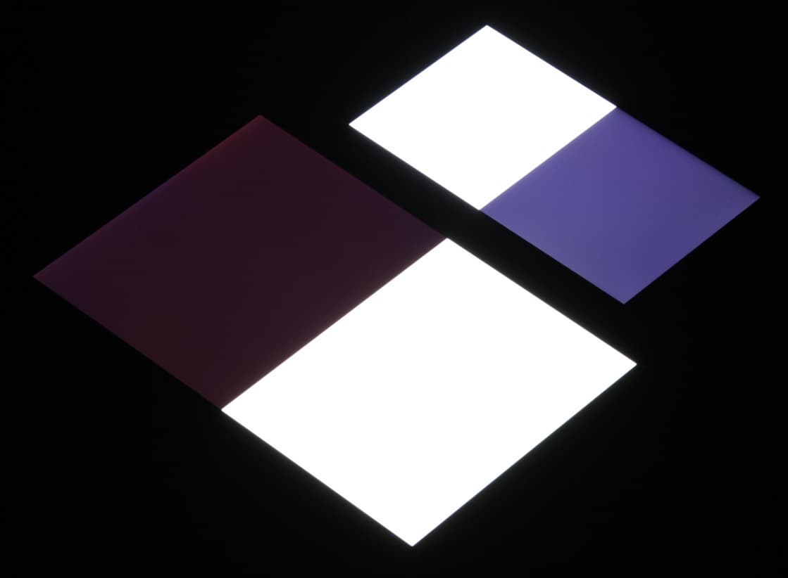 Яркость под углом у экранов уменьшилась (как минимум в 5 раз, исходя из разницы в выдержке), но у Highscreen Power Rage Evo изображение все же чуть ярче. Черное поле при отклонении по диагонали высветляется сильно и приобретает фиолетовый или красно-фиолетовый оттенок. Фотографии ниже это демонстрируют (яркость белых участков в перпендикулярном плоскости экранов направлении одинаковая!):