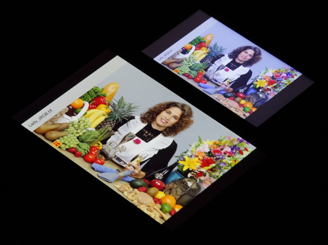 В итоге цвета имеют естественную насыщенность и оттенок. Баланс оттенков на шкале серого средний, так как цветовая температура заметно выше стандартных 6500 К, но отклонение от спектра абсолютно черного тела (ΔE) ниже 10, что для потребительского устройства считается приемлемым показателем. При этом цветовая температура мало изменяется от оттенка к оттенку — это положительно сказывается на визуальной оценке цветового баланса. (Самые темные области шкалы серого можно не учитывать, так как там баланс цветов не имеет большого значения, да и погрешность измерений цветовых характеристик на низкой яркости большая.)