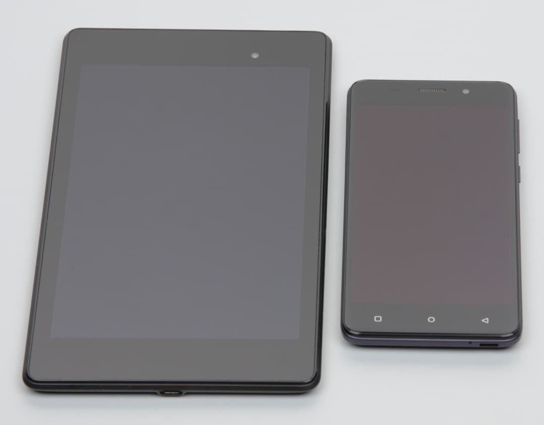 Лицевая поверхность экрана выполнена в виде стеклянной пластины с зеркально-гладкой поверхностью, устойчивой к появлению царапин. Судя по отражению объектов антибликовые свойства экрана лучше, чем у экрана Google Nexus 7 (2013) (далее просто Nexus 7). Для наглядности приведем фотографию, на которой в выключенных экранах отражается белая поверхность (слева — Nexus 7, справа — Highscreen Power Rage Evo, далее их можно различать по размеру):