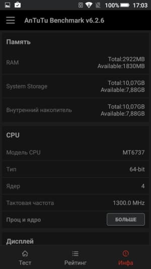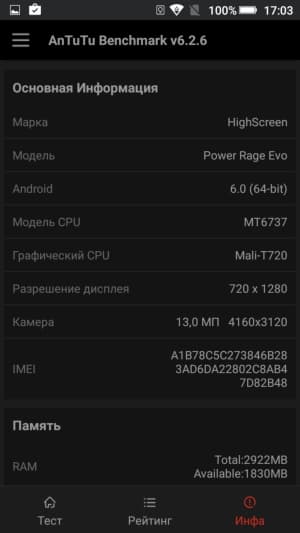 Аппаратная платформа Highscreen Power Rage Evo строится на базе SoC MediaTek MT6737. В конфигурацию данного чипа входит четыре процессорных ядра Cortex-A53, работающих на частоте до 1,3 ГГц. За обработку графики отвечает видеоускоритель Mali-T720. Объем ОЗУ равняется 3 ГБ, что неплохо, а пользовательское хранилище изначально составляет менее 10 ГБ. Около 1,7 ГБ ОЗУ в реальности остаются свободными после перезагрузки, очистки памяти и закрытия всех приложений.