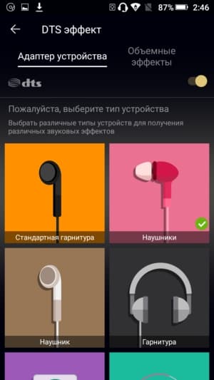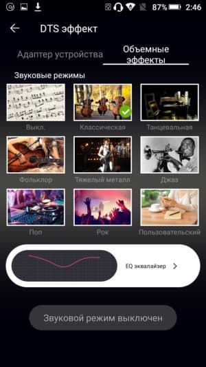 Для прослушивания музыки здесь предназначен музыкальный проигрыватель с симпатичным интерфейсом и богатым набором дополнительных настроек на основе системы виртуального звука DTS с возможностью выбора пресетов эквалайзера под определенные типы наушников. Звучит в наушниках смартфон на удивление качественно: звук глубокий, басовитый, чистый и довольно мощный, прослушивание музыкальных композиций здесь вполне комфортно.