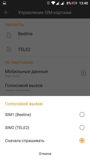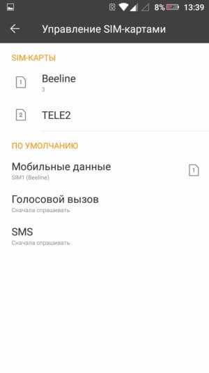Платформа смартфона не поддерживает одновременную работу с двумя SIM-картами 3G и 4G. То есть карты таких операторов, как Tele2, не будут работать в 3G на голосовую связь (а в 2G они просто не умеют работать), если под передачу данных в 4G будет выделена карта из другого слота. Интерфейс позволяет выбрать для каждой из функций определенную карту заранее или прямо во время соединения. Работают карты в режиме Dual SIM Dual Standby, радиомодем здесь один.