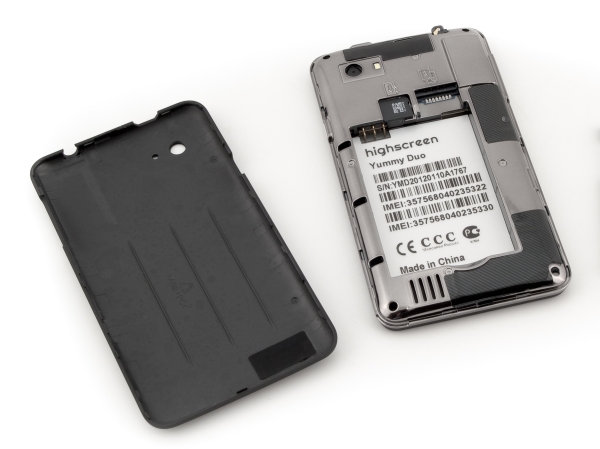 В конструкции Highscreen Yummy Duo видится один неприятный момент: поскольку это многосимочный аппарат, то логично предположить, что пользователь станет использовать несколько SIM-карт, меняя их сообразно ситуации, например, во время зарубежных поездок и т. п. Следовательно, производитель просто обязан был предусмотреть частое использование слотов для SIM-карт и либо вынести эти слоты наружу, прикрыв заглушками, либо уж делать для задней крышки надежный крепеж в виде подпружиненной кнопки, который бы придал крышке долговечности. Но, конечно же, никто не собирался выказывать здесь такую заботу о пользователе: крышка стандартно крепится на нескольких пластмассовых защелках, которые от частого использования разболтаются или вовсе сломаются. Отнять крышку от корпуса, опять же, чрезвычайно трудно — ногти ломаются, ухватиться не за что, в итоге для снятия прилагаются усилия, несоизмеримые с поставленной задачей, а крышка отрывается с жутким хрустом. Врагу не пожелаешь часто снимать такую крышку, и уж точно аппарат не рекомендован к покупке тем людям, которые собираются постоянно менять SIM-карты.
