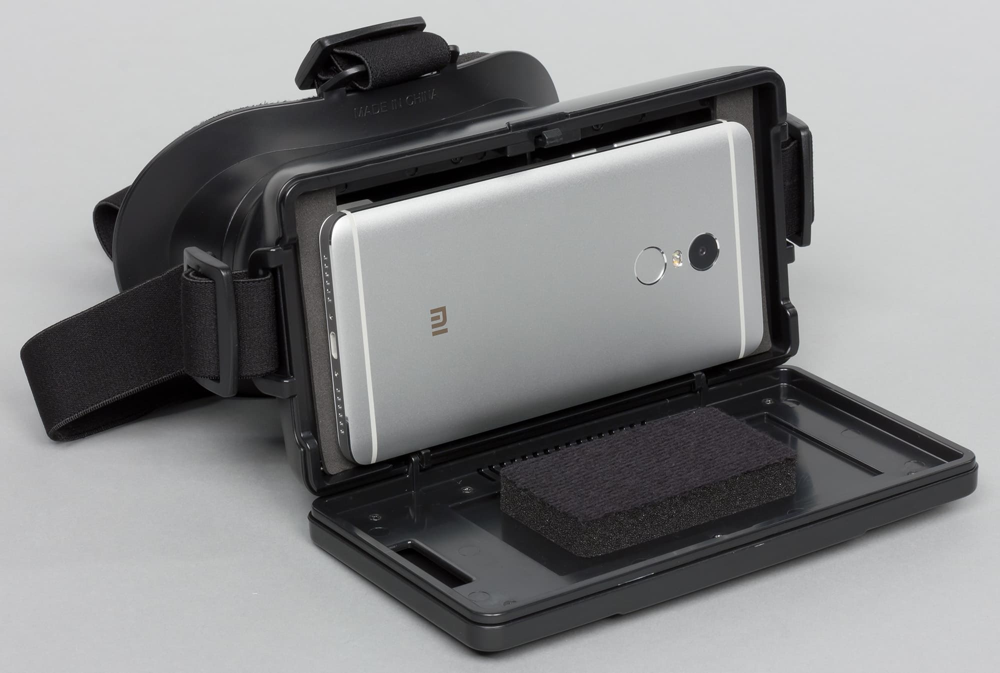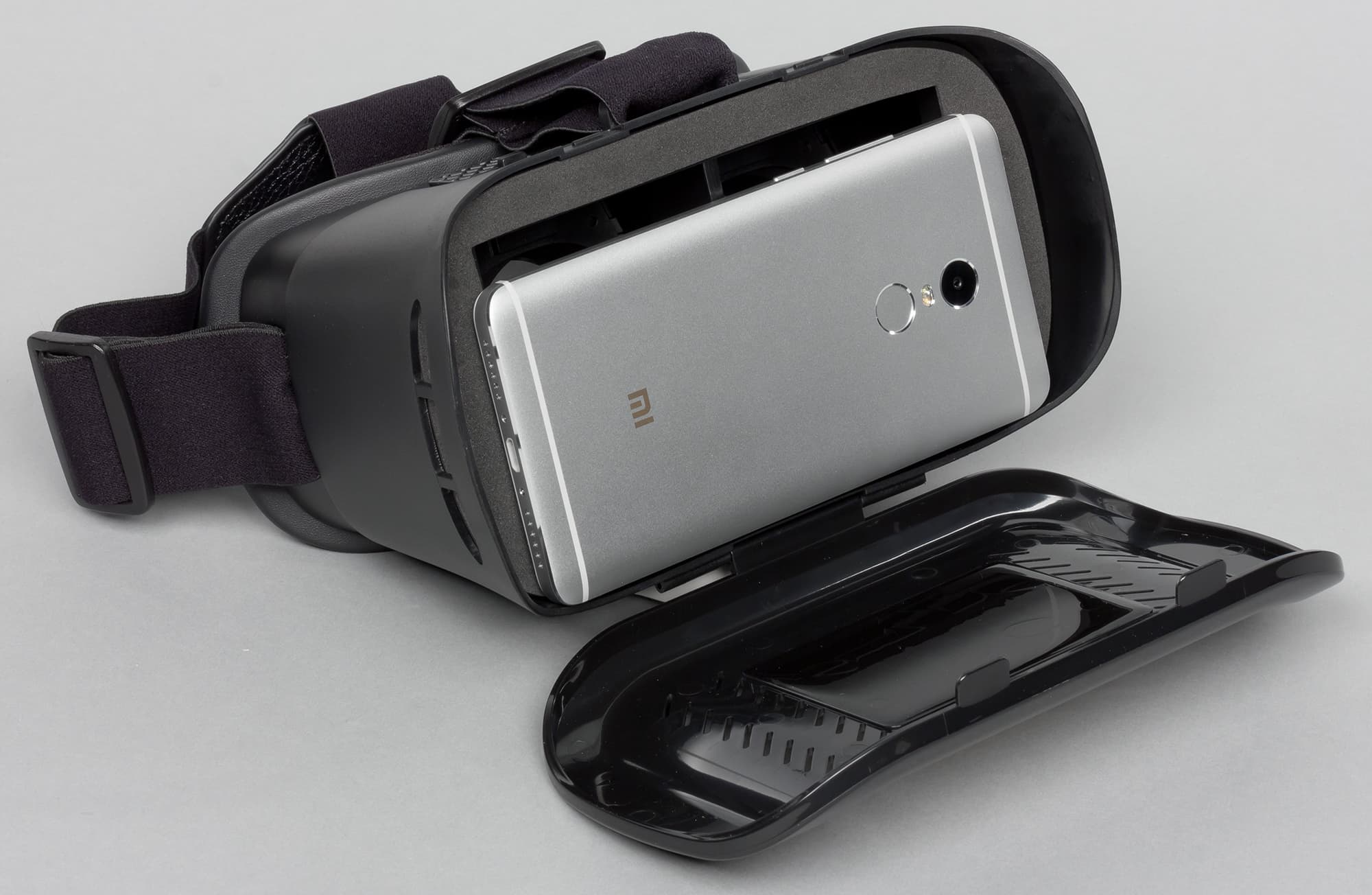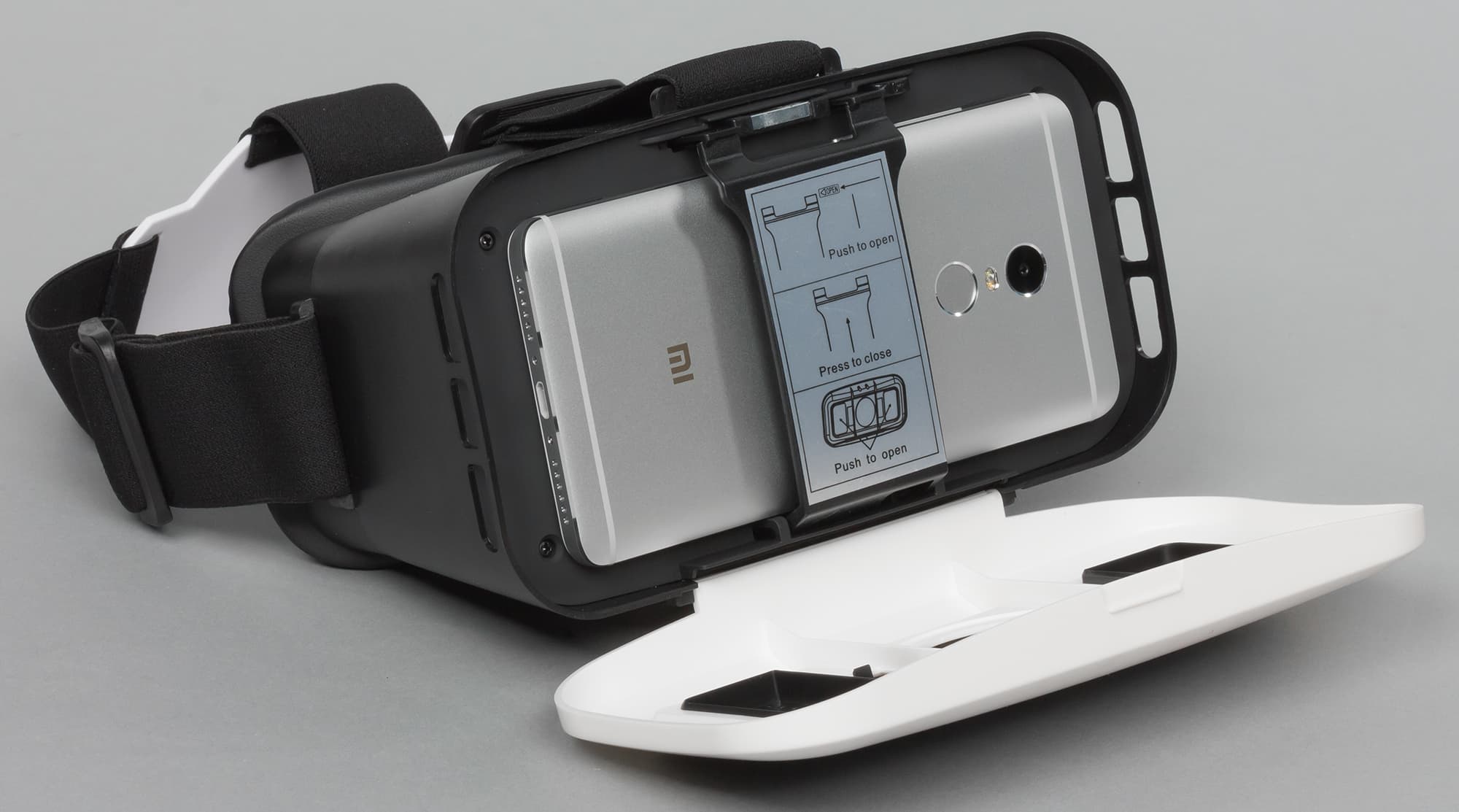 Однако было бы странно ждать большего при официальной цене 1190 рублей. Нет здесь и регулировки расстояния между линзами и глазами пользователя. Зато производитель продумал удобный механизм для установки смартфона. Чтобы открылась крышка, под которую надо его положить, достаточно нажать на кнопочку на верхней стороне гарнитуры.