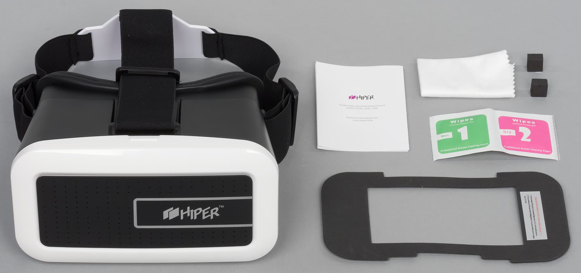 Комплектация у Hiper VRM тоже куда более интересная, чем у самой дешевой модели. Помимо самого устройства пользователь получает тряпочку для протирки линз, а также две салфетки — сухую и влажную. Их, вероятно, стоит использовать для очистки амбушюра и тех частей гарнитуры, которые соприкасаются с лицом.