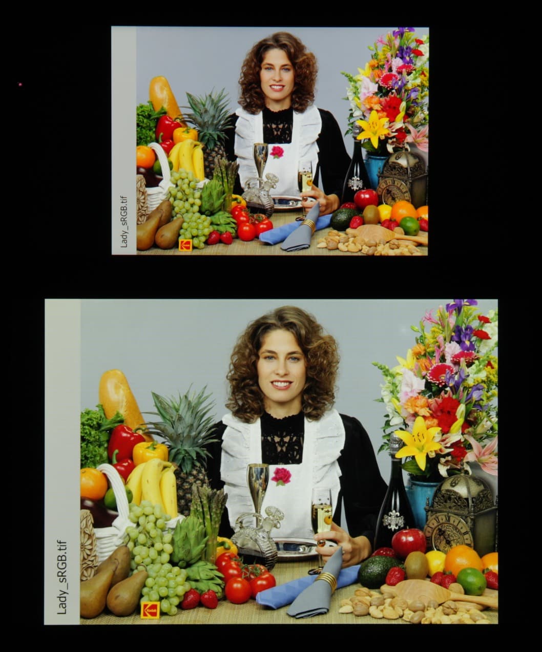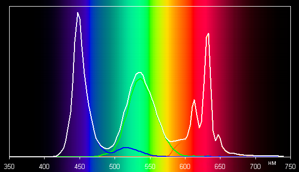 Спектры компонент достаточно хорошо разделены, что и обуславливает широкий цветовой охват. Для потребительского устройства широкий цветовой охват является недостатком, поскольку в итоге цвета изображений — рисунков, фотографий и фильмов, — ориентированных на пространство sRGB (а таких подавляющее большинство), имеют неестественную насыщенность. Особенно это заметно на узнаваемых оттенках, например на оттенках кожи. Результат приведен на фотографиях выше.