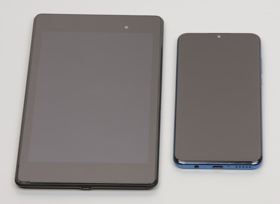 Лицевая поверхность экрана выполнена в виде стеклянной пластины с зеркально-гладкой поверхностью, устойчивой к появлению царапин. Судя по отражению объектов, антибликовые свойства экрана лучше, чем у экрана Google Nexus 7 (2013) (далее просто Nexus 7). Для наглядности приведем фотографию, на которой в выключенных экранах отражается белая поверхность (слева — Nexus 7, справа — Honor 20 Lite, далее их можно различать по размеру):