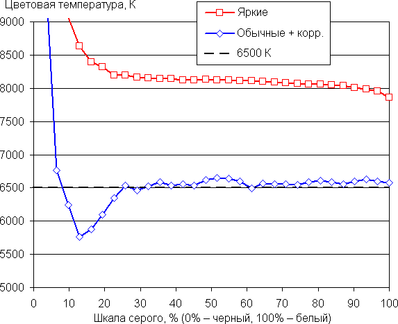Баланс оттенков на шкале серого после выбора профиля Обычные не идеальный, так как на большей части шкалы серого цветовая температура близка к стандартным 6500 К, но отклонение от спектра абсолютно черного тела (ΔE) порядка 10, что даже для потребительского устройства считается не очень хорошим показателем. Мы попробовали выполнить дополнительную коррекцию, передвинув точку на круге в положение, как на снимке выше. На графиках ниже кривые Яркие соответствуют результатам, полученным после выбора профиля Яркие, а кривые Обычные + корр. — данным, полученным после выбора профиля Обычные и выполненной коррекции. (Самые темные области шкалы серого можно не учитывать, так как там баланс цветов не имеет большого значения, да и погрешность измерений цветовых характеристик на низкой яркости большая.)