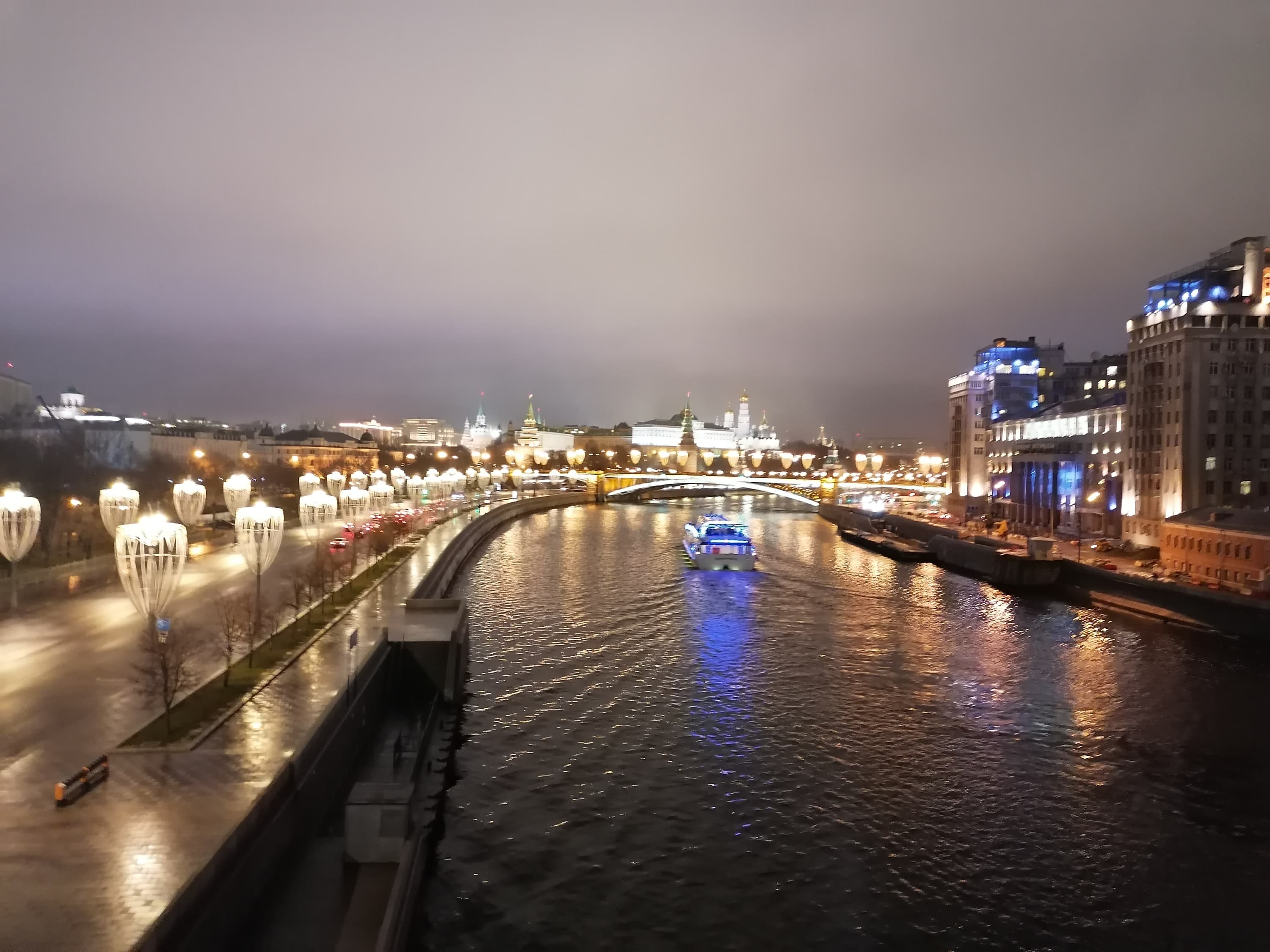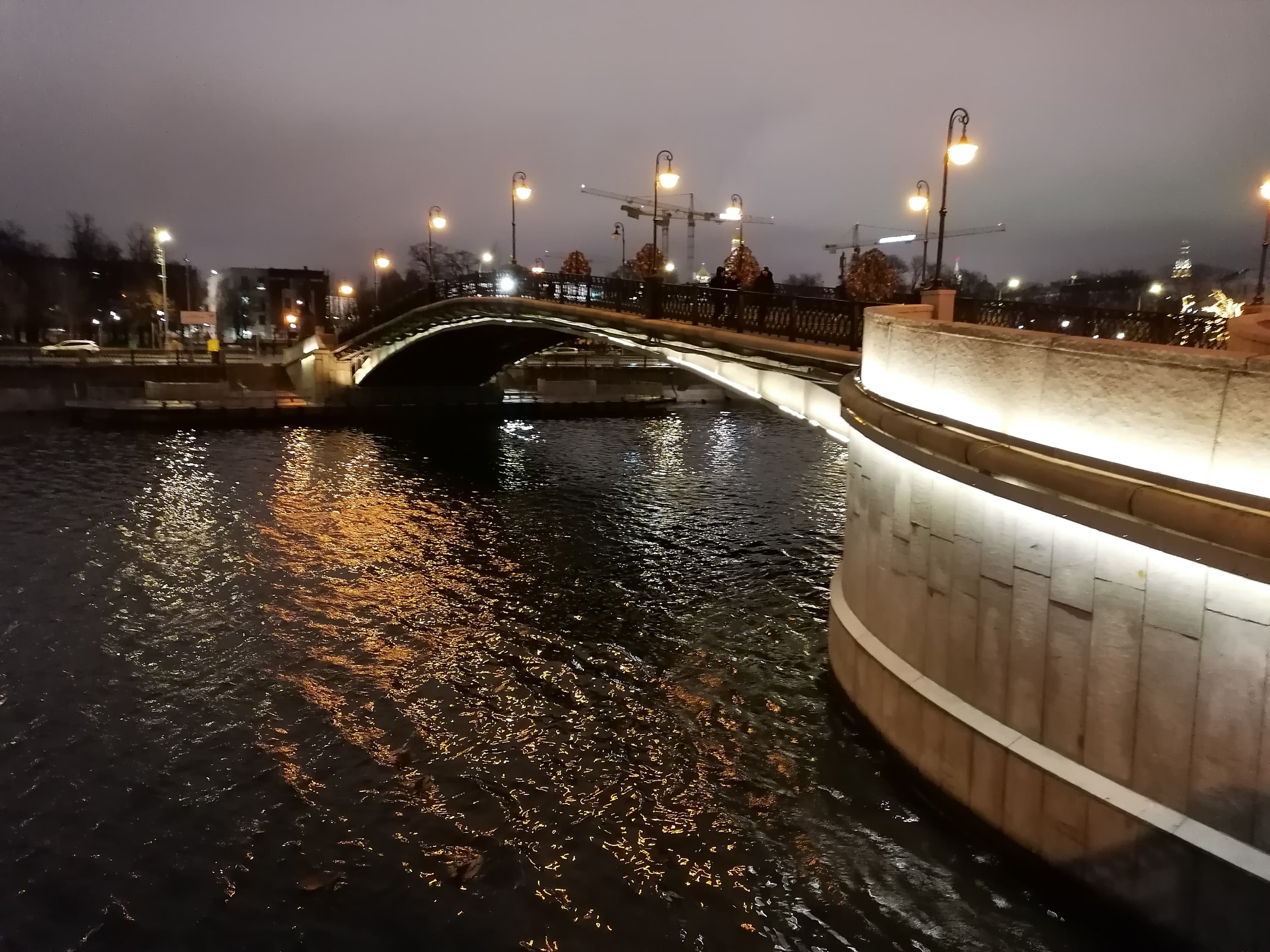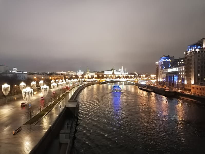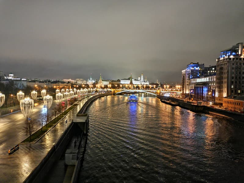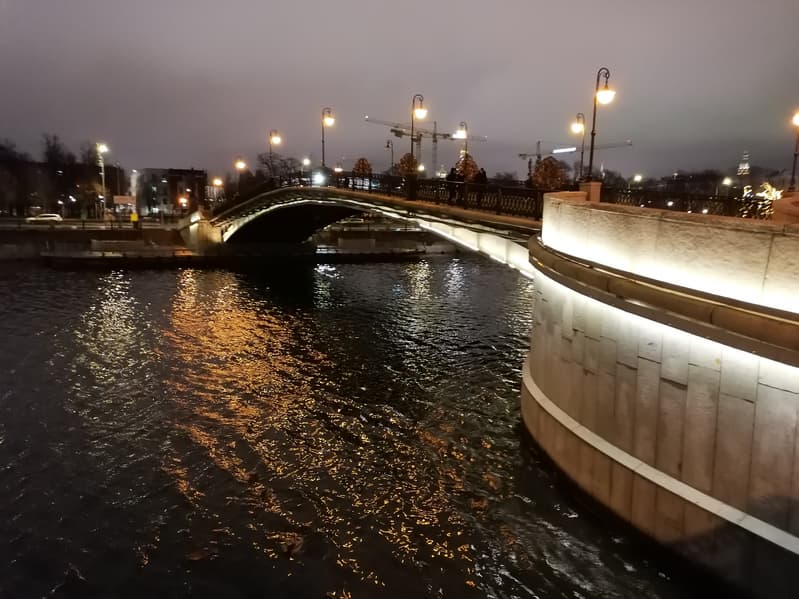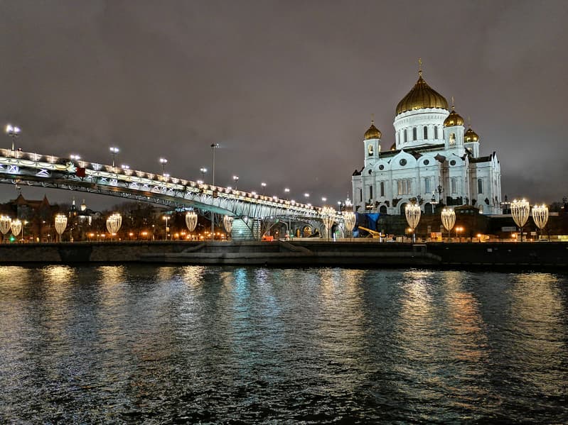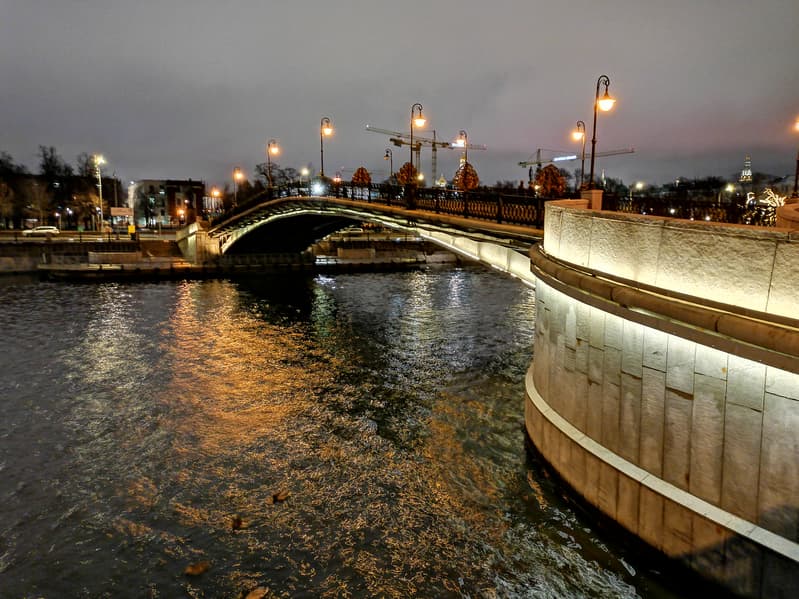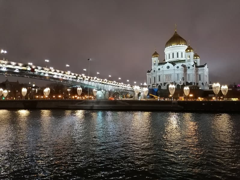 Другой пример — уже с берега. Здесь картина та же: ночной режим смог вытянуть детали на белом подсвеченном Храме Христа Спасителя, очертания прояснились. Можно обратить внимание, что рябь на воде стала более мелкой — таков эффект синтезированной длинной выдержки.