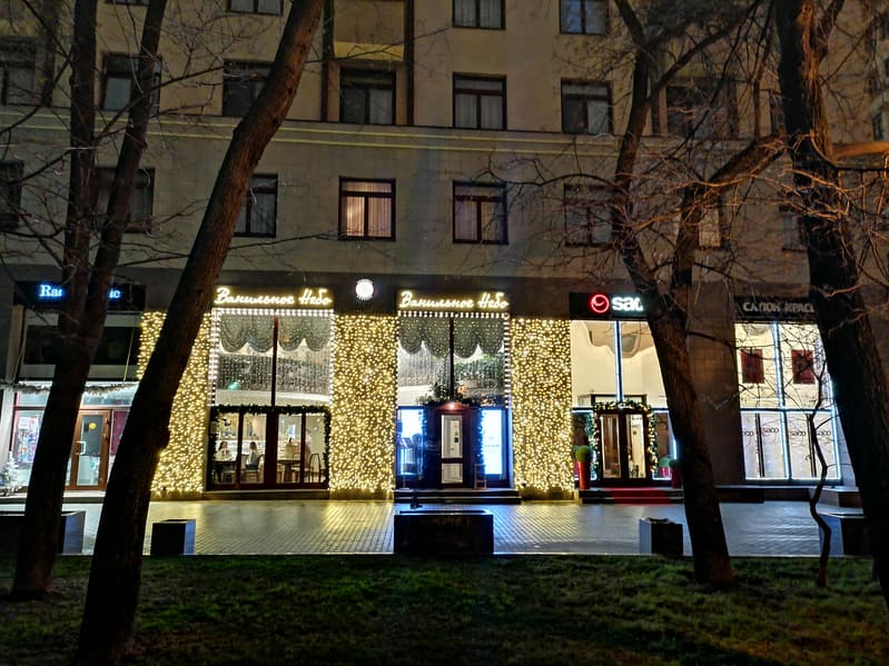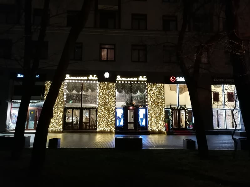 А вот это просто отличное место для испытания ночного режима: тёмный сквер с видом на яркую витрину с гирляндами. Обычный режим (с ИИ и без) справился неплохо: отдельные лампочки хорошо различимы. Но если включить «Ночь», то становятся видны верхние этажи здания, деревья, трава и каждая плиточка на тротуаре.