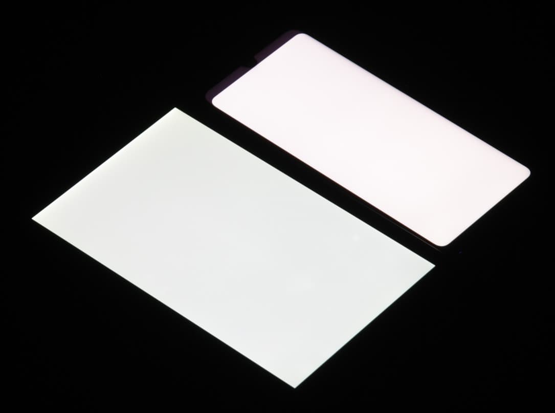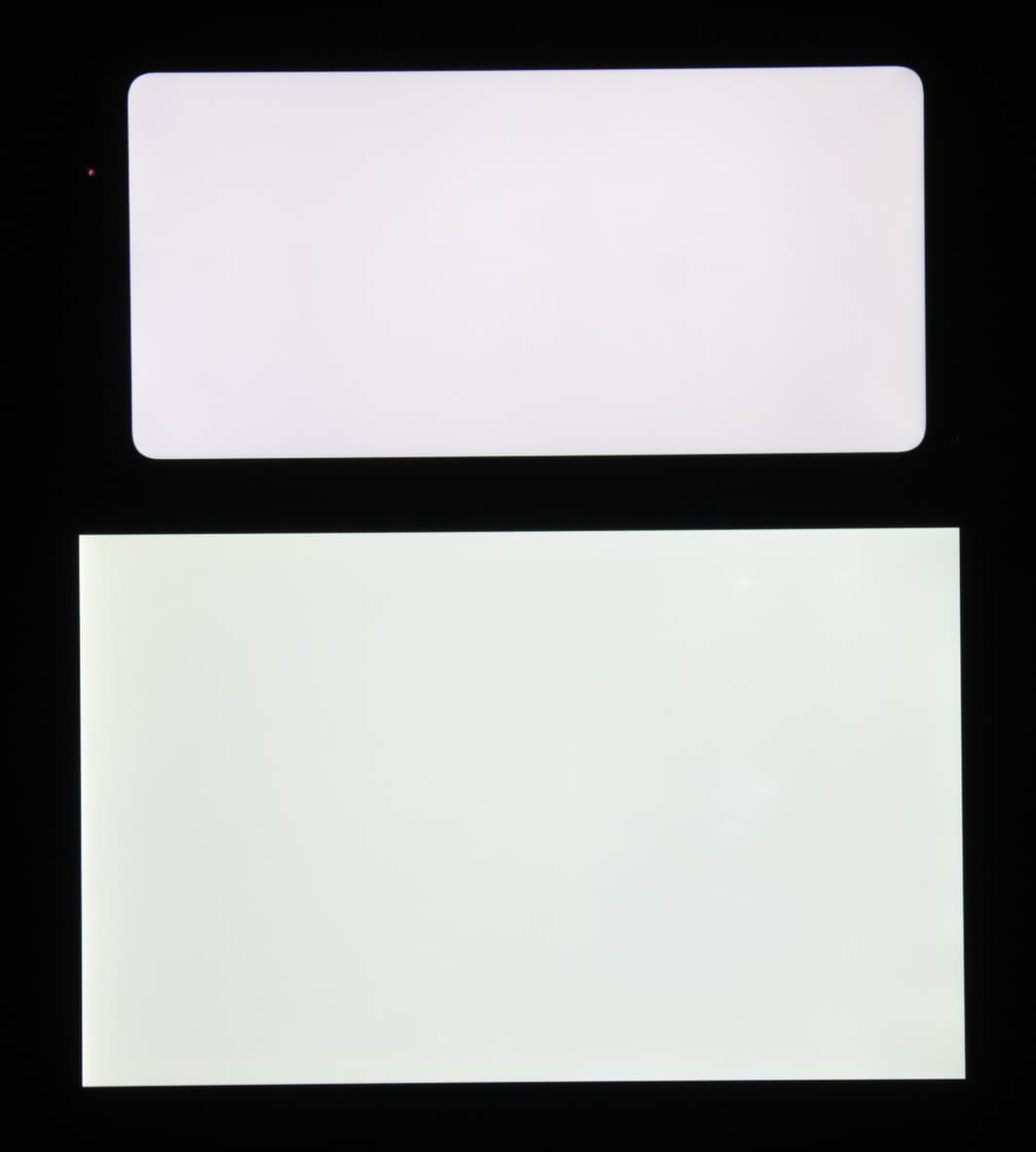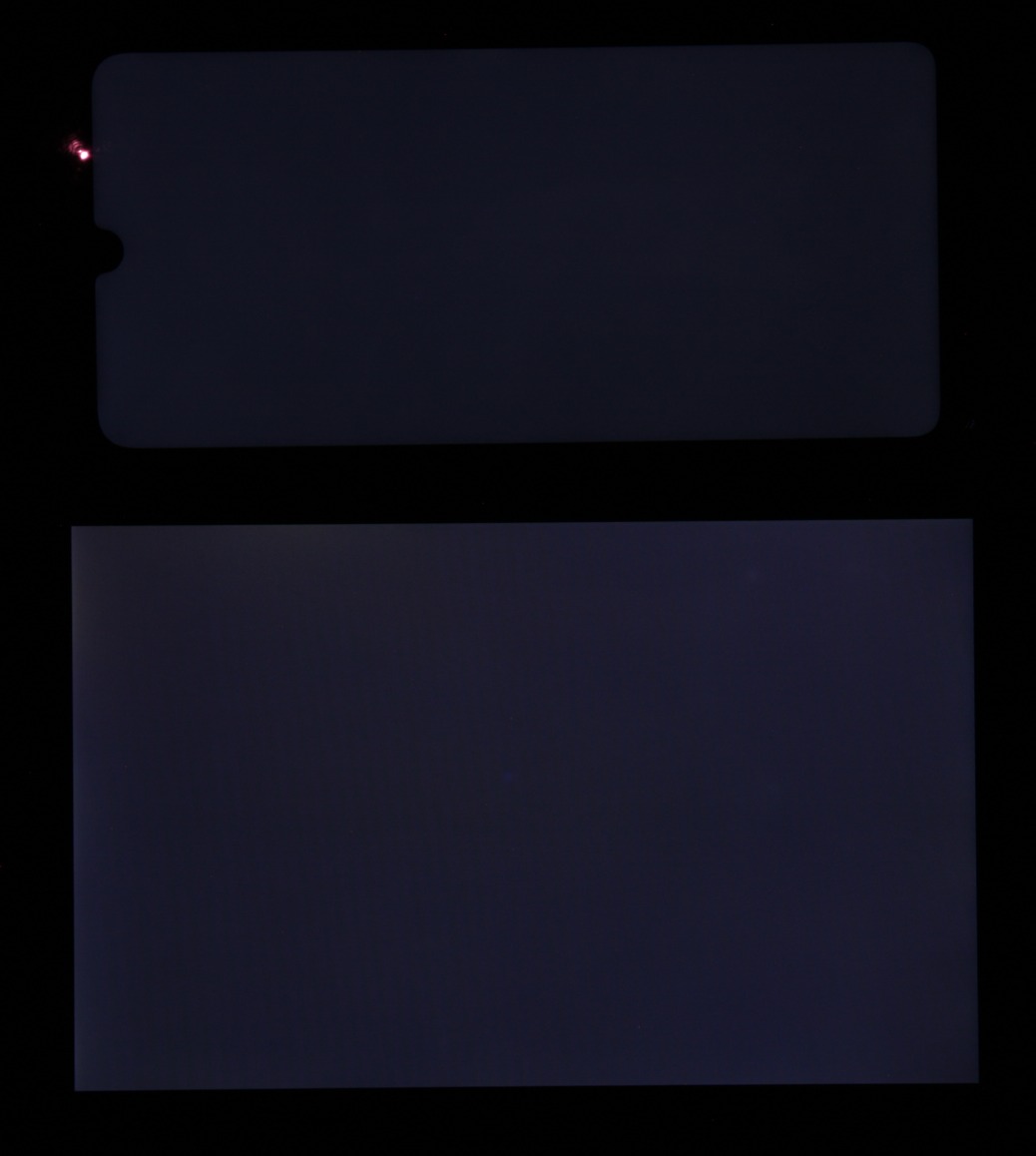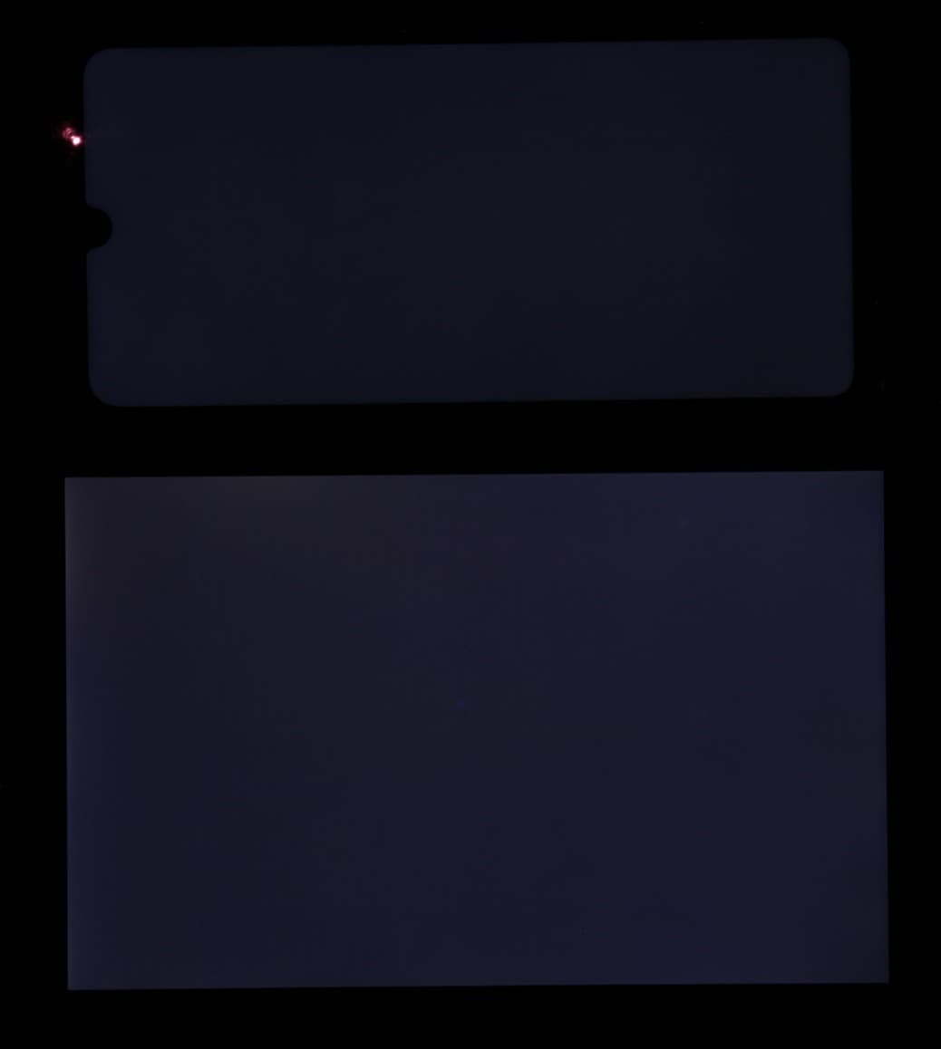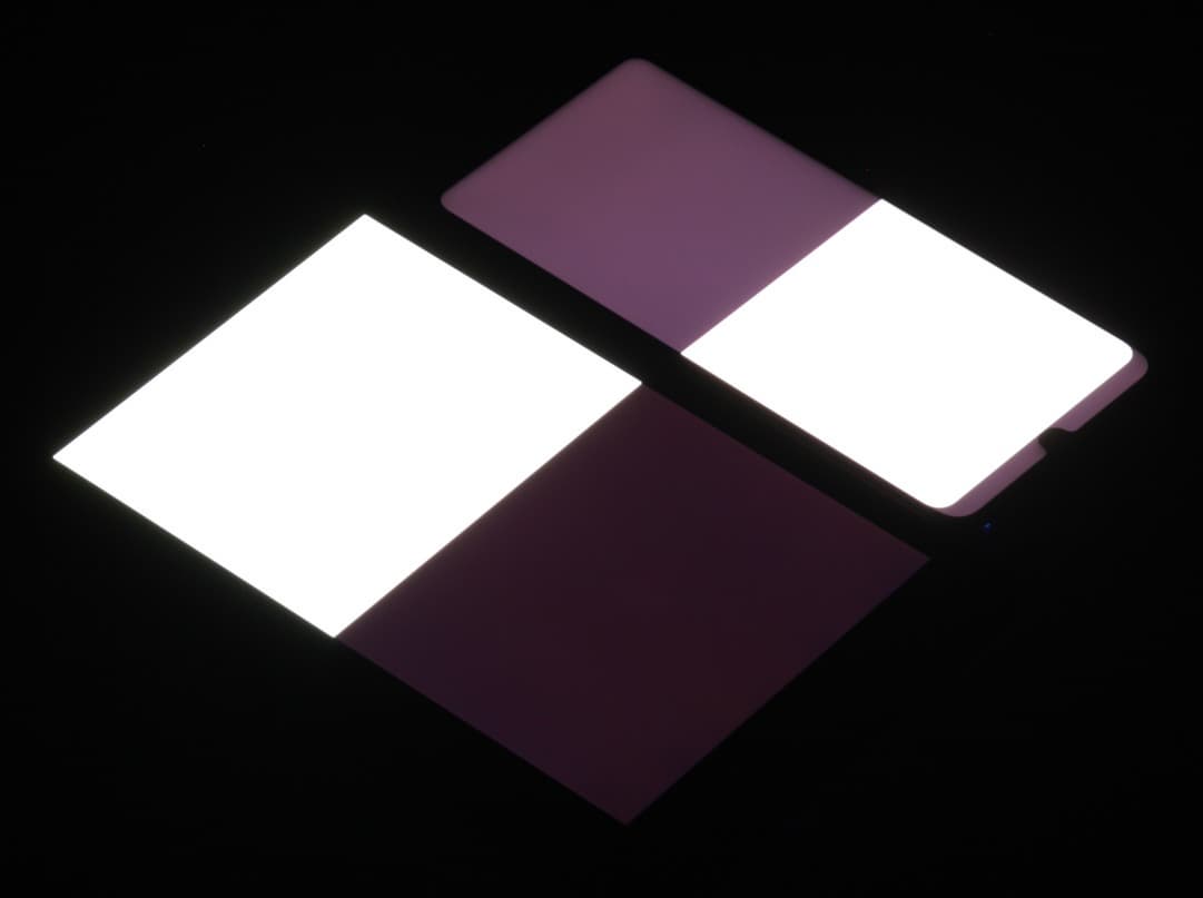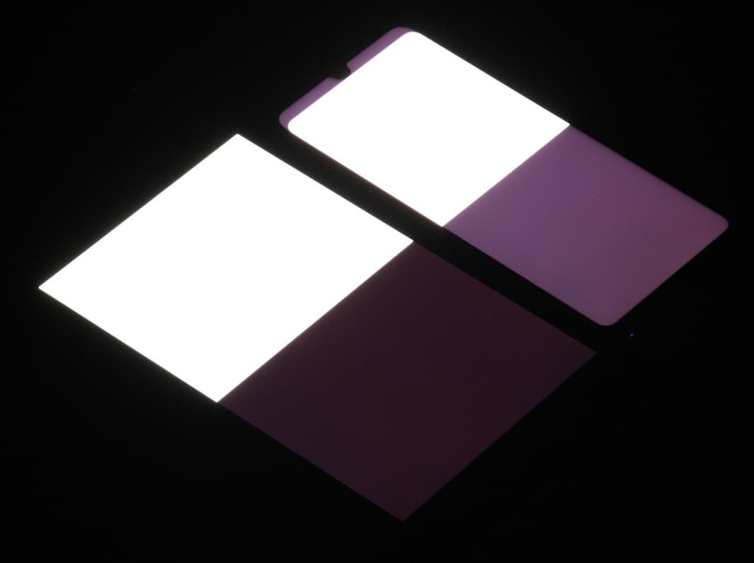Яркость под углом у экранов уменьшилась (как минимум в 5 раз, исходя из разницы в выдержке), но у Honor 20S экран все же немного светлее. Черное поле при отклонении по диагонали высветляется сильно, и приобретает красноватый оттенок. Фотографии ниже это демонстрируют (яркость белых участков в перпендикулярном плоскости экранов направлении одинаковая!):