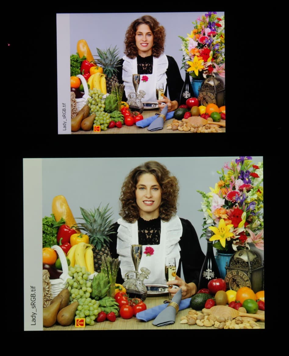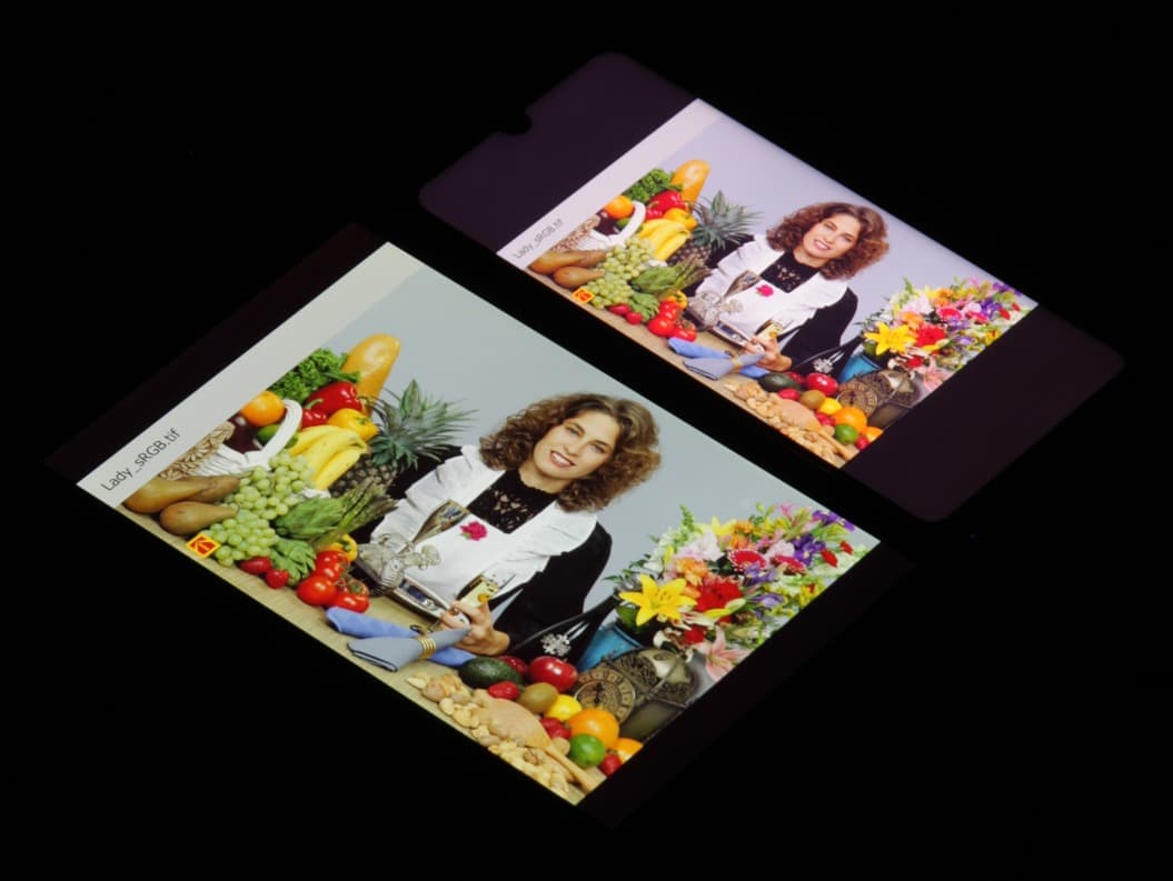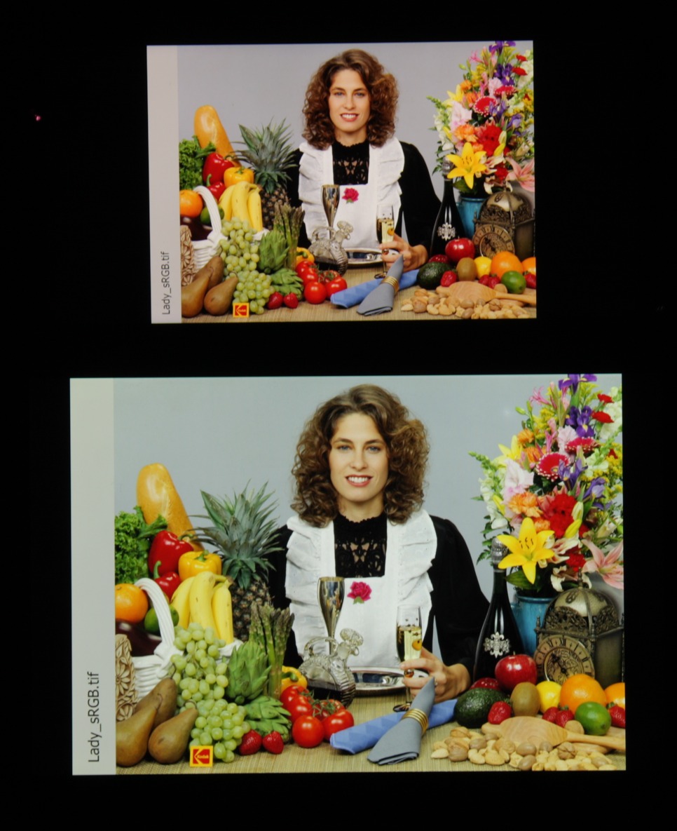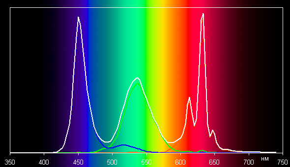 Спектры компонент достаточно хорошо разделены, что и обуславливает широкий цветовой охват. Для потребительского устройства широкий цветовой охват является недостатком, поскольку в итоге цвета изображений — рисунков, фотографий и фильмов, — ориентированных на пространство sRGB (а таких подавляющее большинство), имеют неестественную насыщенность. Особенно это заметно на узнаваемых оттенках, например на оттенках кожи. Результат приведен на фотографиях выше.