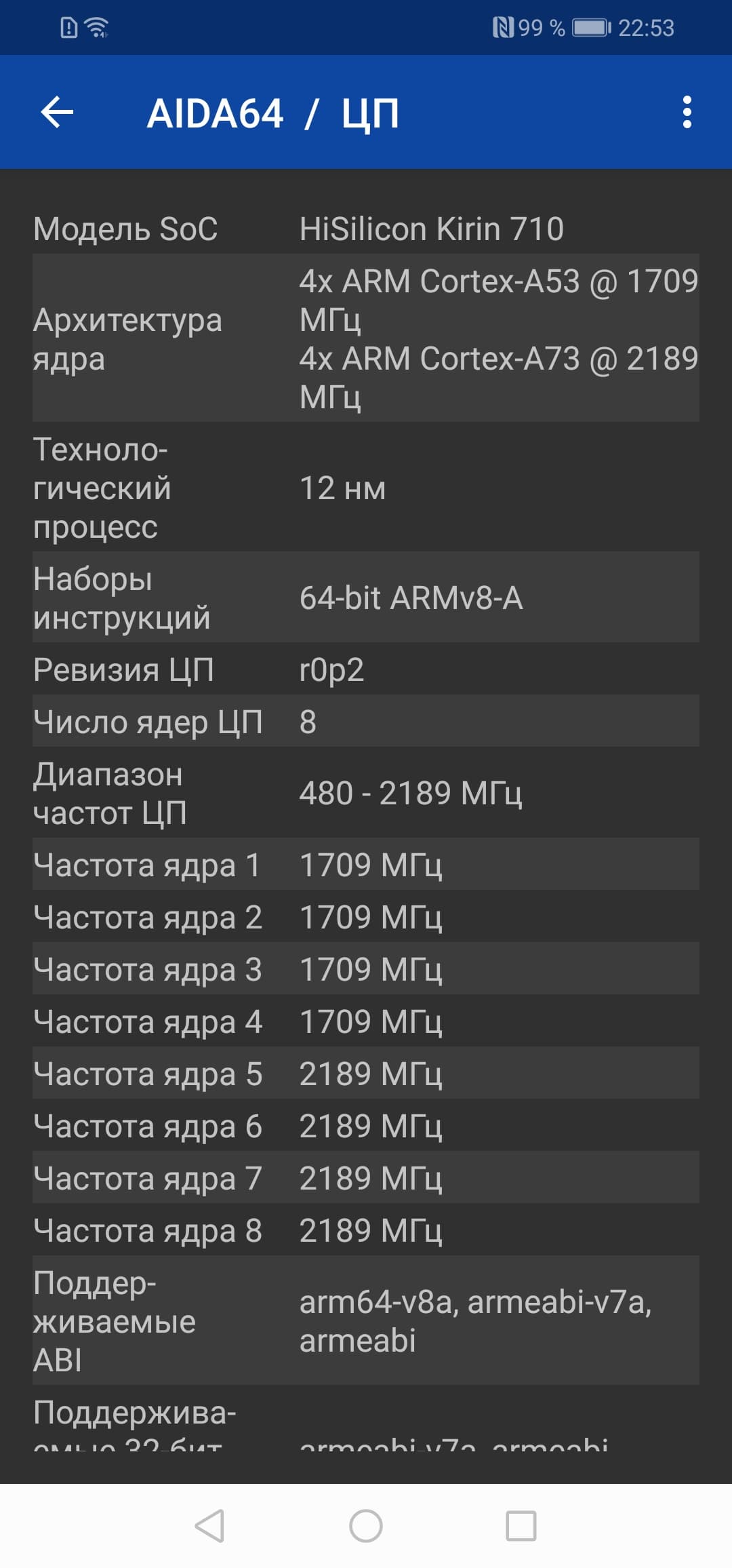 - SoC Kirin 710, 8 ядер: 4×Cortex-A73 @2,2 ГГц + 4×Cortex-A53 @1,7 ГГц
