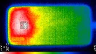 Нагрев больше в верхней части аппарата, что, видимо, соответствует расположению микросхемы SoC. По данным теплокамеры, максимальный нагрев составил 44 градуса (при температуре окружающего воздуха в 24 градуса), это выше среднего значения в данном тесте для современных смартфонов.