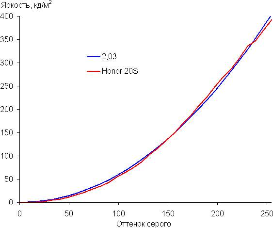 Контрастность (примерно в центре экрана) высокая — порядка 1200:1. Время отклика при переходе черный-белый-черный равно 20 мс (10 мс вкл. + 10 мс выкл.). Переход между полутонами серого 25% и 75% (по численному значению цвета) и обратно в сумме занимает 32 мс. Построенная по 32 точкам с равным интервалом по численному значению оттенка серого гамма-кривая не выявила завала ни в светах, ни в тенях. Показатель аппроксимирующей степенной функции равен 2,03, что ниже стандартного значения 2,2. При этом реальная гамма-кривая заметно отклоняется от степенной зависимости: