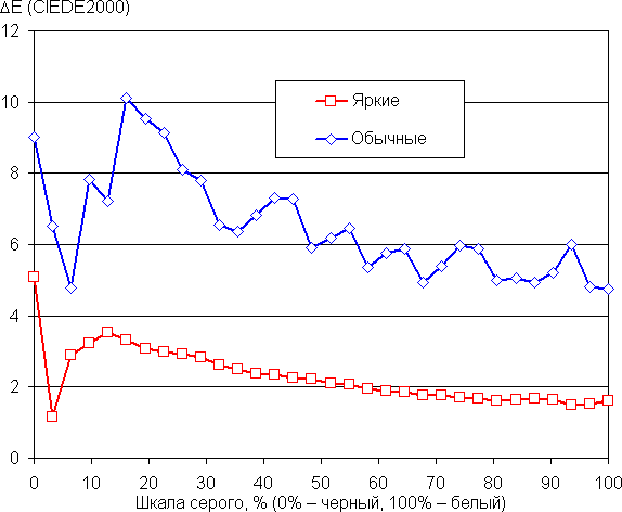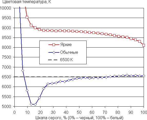 Баланс оттенков на шкале серого после выбора профиля Обычные приемлемый, так как на большей части шкалы серого цветовая температура близка к стандартным 6500 К, а отклонение от спектра абсолютно черного тела (ΔE) ниже 10, что для потребительского устройства считается приемлемым показателем. Особой надобности в дополнительной коррекции нет. На графиках ниже кривые Яркие соответствуют результатам, полученным после выбора профиля Яркие, а кривые Обычные — данным, полученным после выбора профиля Обычные. (Самые темные области шкалы серого можно не учитывать, так как там баланс цветов не имеет большого значения, да и погрешность измерений цветовых характеристик на низкой яркости большая.)