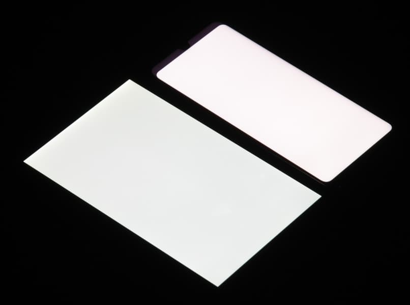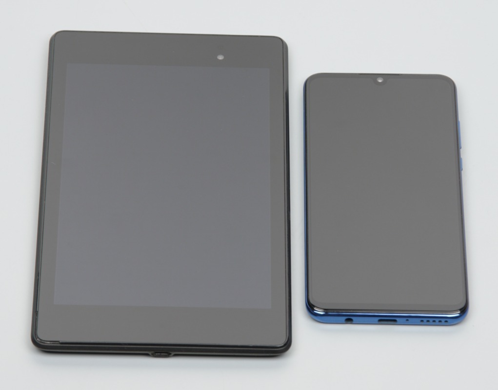 Лицевая поверхность экрана выполнена в виде стеклянной пластины с зеркально-гладкой поверхностью, устойчивой к появлению царапин. Судя по отражению объектов, антибликовые свойства экрана лучше, чем у экрана Google Nexus 7 (2013) (далее просто Nexus 7). Для наглядности приведем фотографию, на которой в выключенных экранах отражается белая поверхность (слева — Nexus 7, справа — Honor 20S, далее их можно различать по размеру):