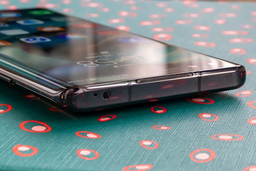 Дисплей вообще сделали настолько большим, что на передней панели не осталось места для классического динамика. Его разместили на самом стыке фронтальной панели и боковины девайса — так, что мелкая защитная сетка образовала фаску в 45º. Опять же решили сразу две задачи: такое расположение разговорного динамика позволило растянуть дисплей в высоту, а заодно это работает на узнаваемость модели.