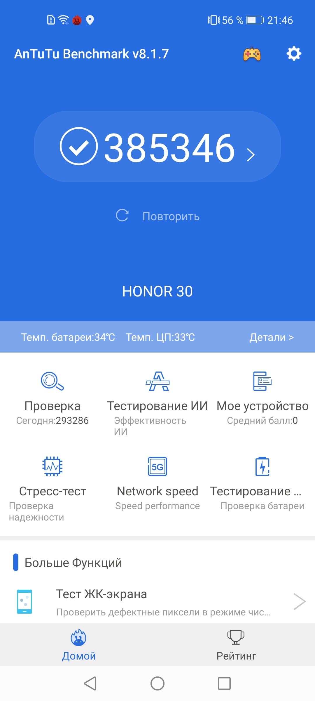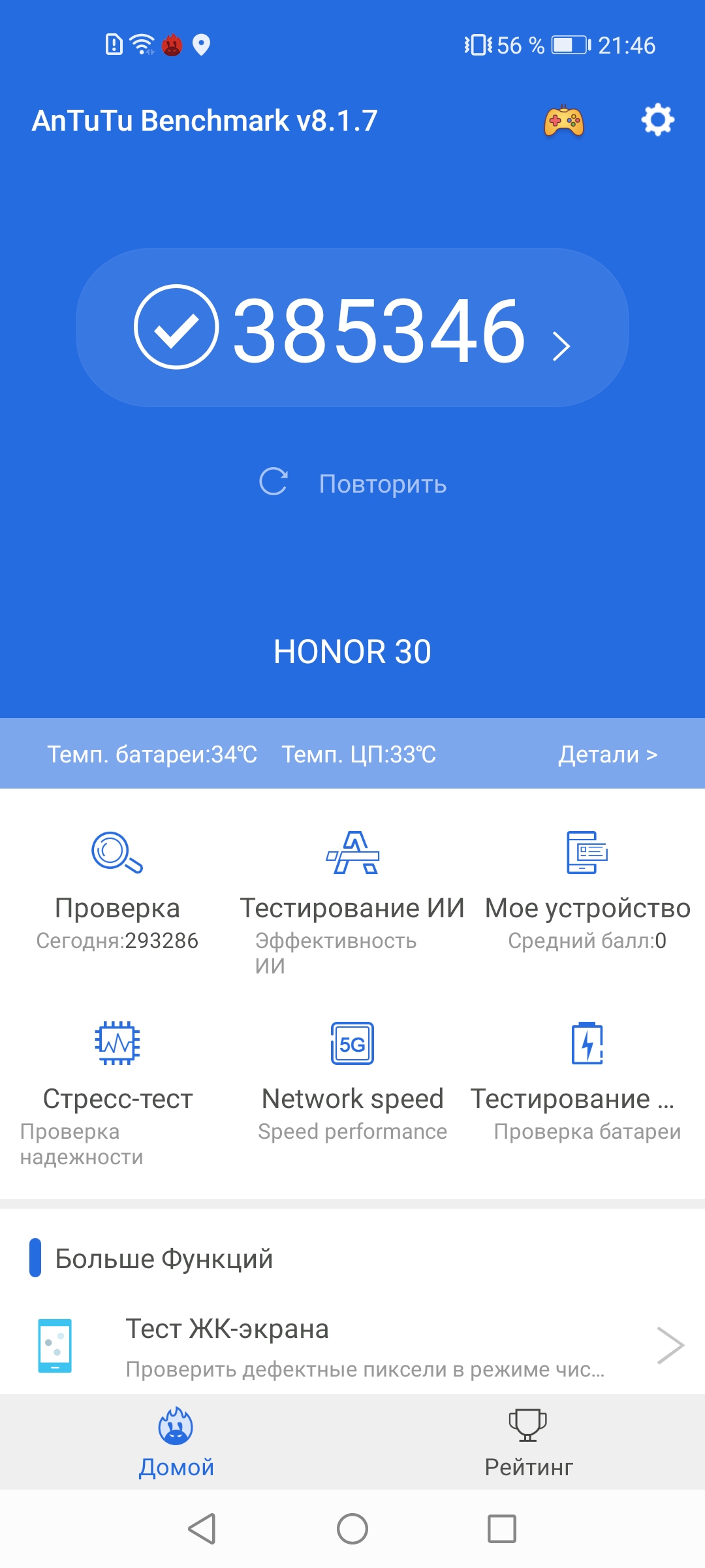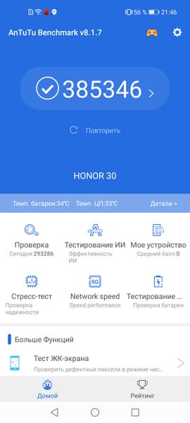 SoC Kirin 985 — не такая мощная платформа, как Kirin 990, но она куда новее и обладает лучшей архитектурой набора команд. Да и результаты в тестах выдает ближе не к Kirin 820, на которой построен Honor 30S, а к настоящим флагманам на Kirin 990. Это очень мощная для своего уровня, субфлагманская платформа, для которой пока нет задач, с которыми она бы не справилась, будь то тяжелые приложения или требовательные игры.