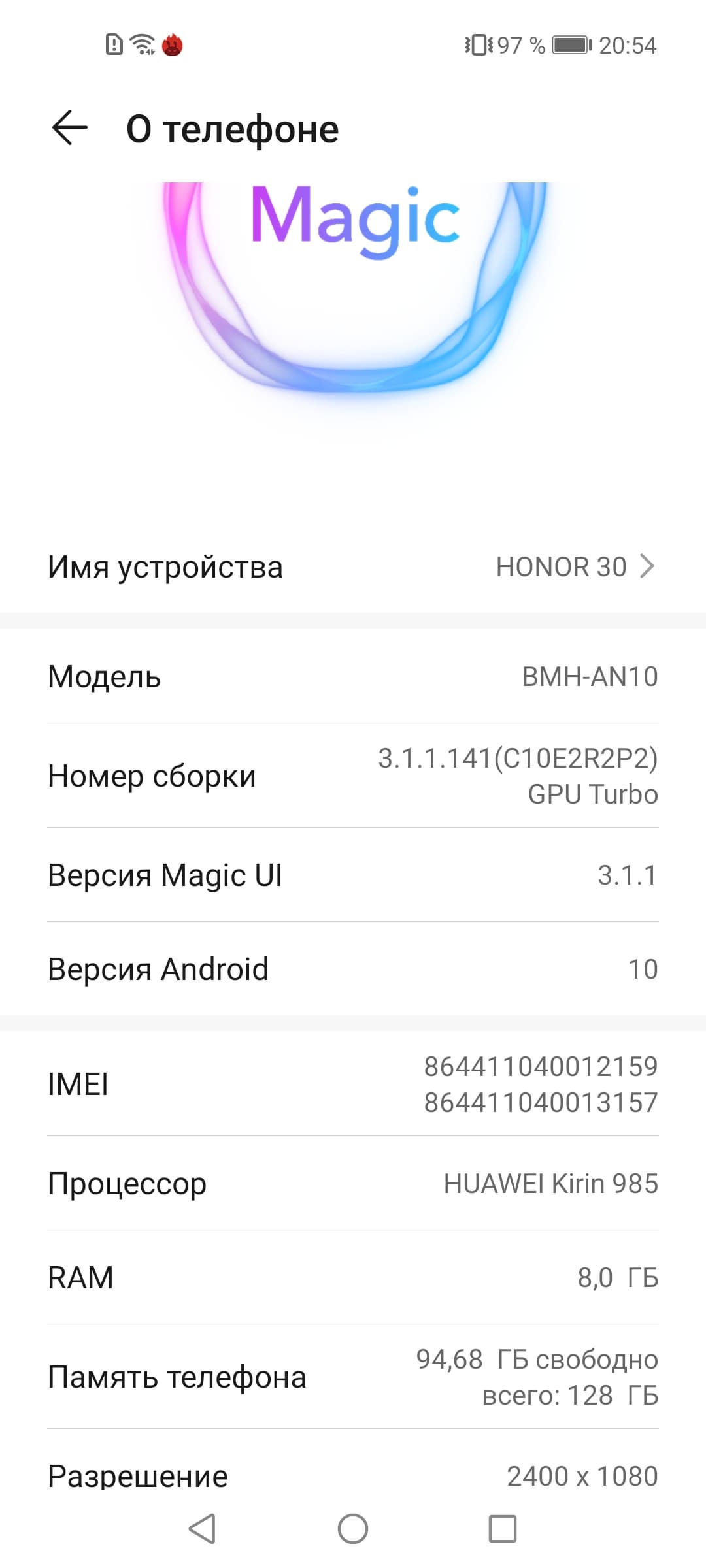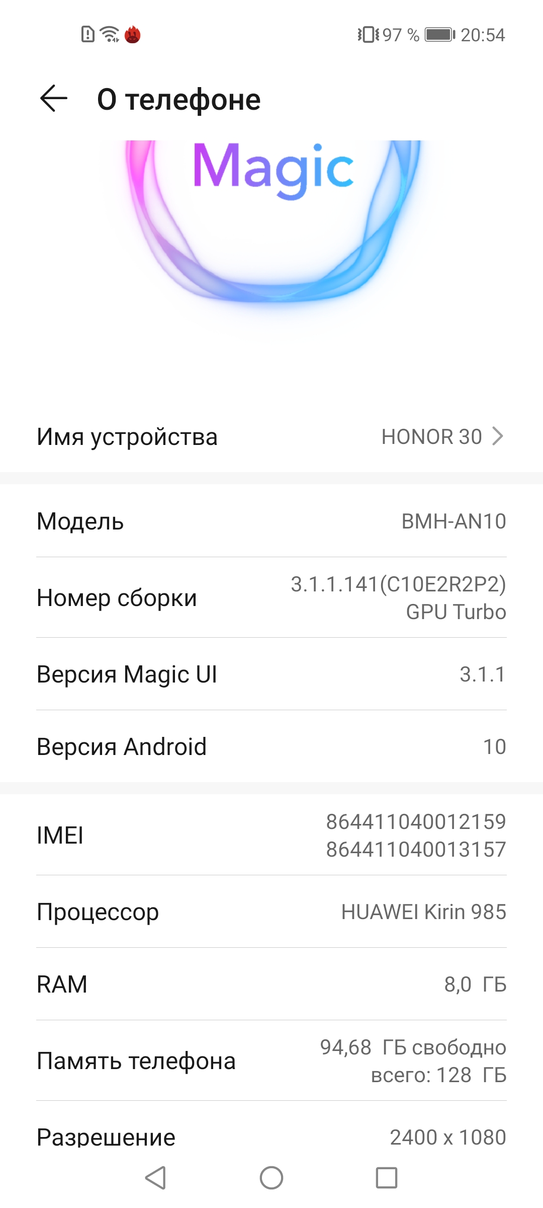 В качестве программной платформы используется ОС Android 10-й версии с собственным интерфейсом MagicUI 3.1.1. На смартфон не предустановлены приложения и сервисы Google, а сделать это самостоятельно — не тривиально. Многие, даже четко следуя инструкциям (их нетрудно найти в Сети), получают поток уведомлений от системы защиты Google Play, и пользоваться смартфоном при этом просто некомфортно. Поэтому мы все же будем рассматривать устройство «как есть».