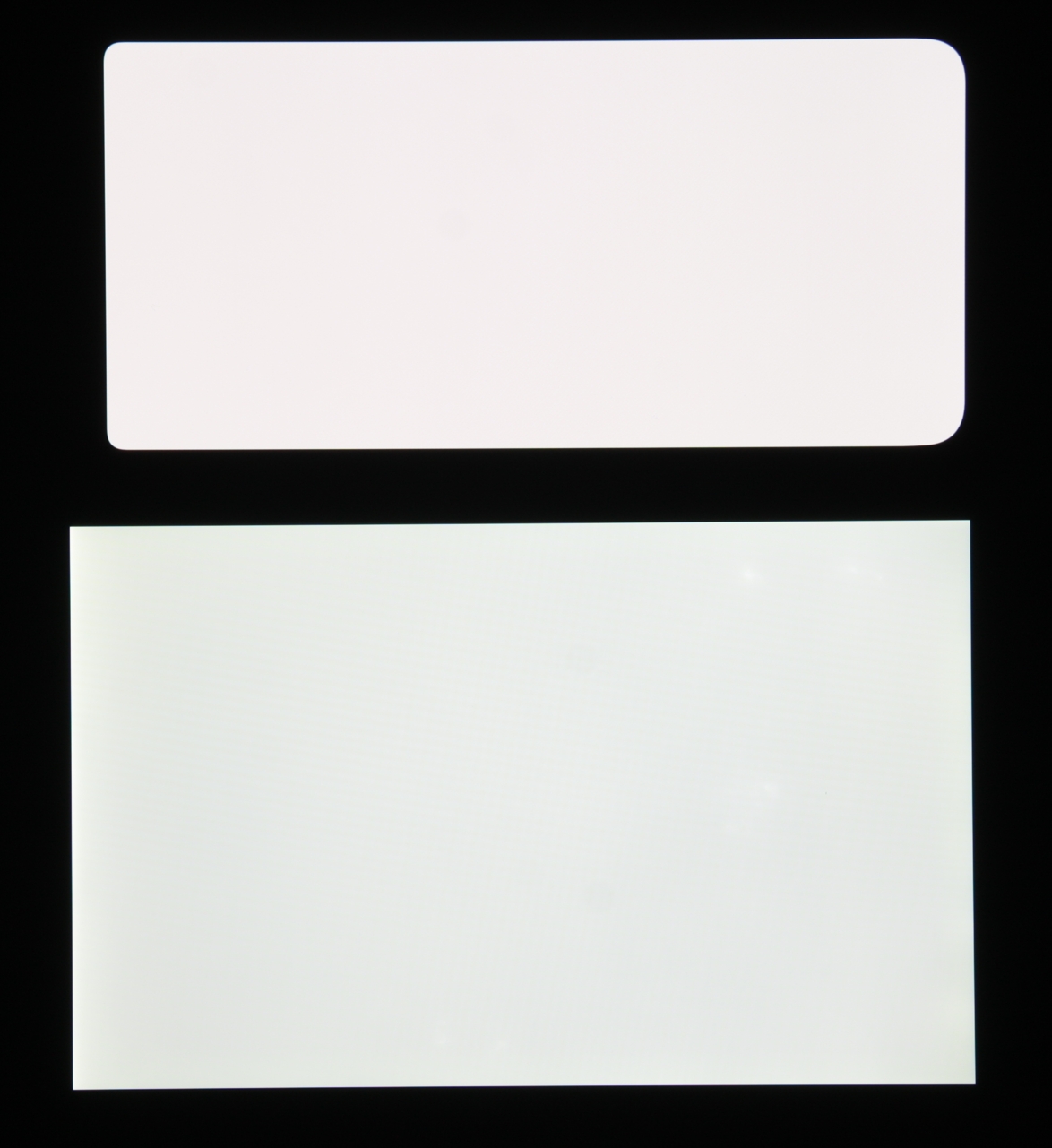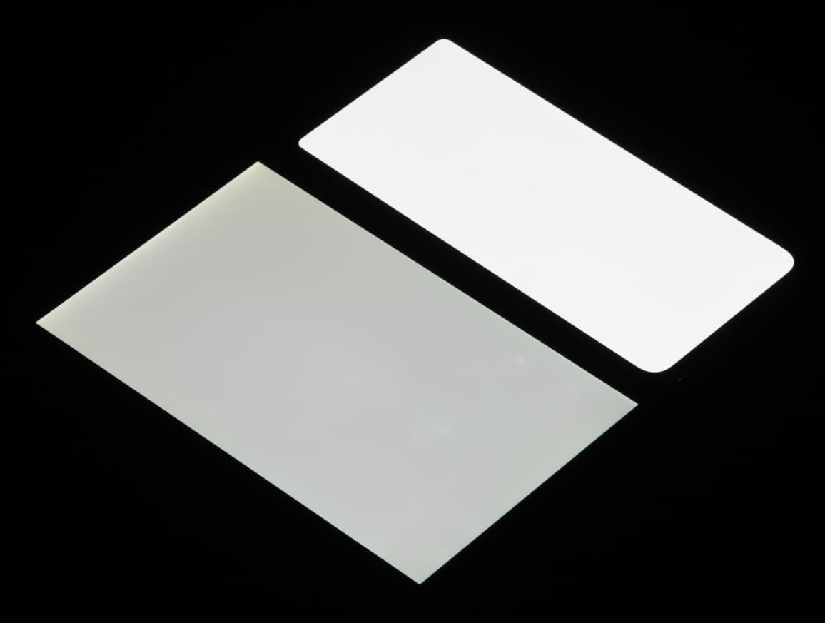 Экран характеризуется великолепными углами обзора. Правда, белый цвет при отклонении даже на небольшие углы приобретает едва заметный сине-зеленый или розоватый оттенок. Зато черный цвет остается просто черным под любыми углами. Он настолько черный, что параметр контрастности в данном случае неприменим. Для сравнения приведем фотографии, на которых на экраны Honor 30 (профиль Обычные [цвета]) и второго участника сравнения выведены одинаковые изображения, при этом яркость экранов изначально установлена примерно на 200 кд/м², а цветовой баланс на фотоаппарате принудительно переключен на 6500 К.