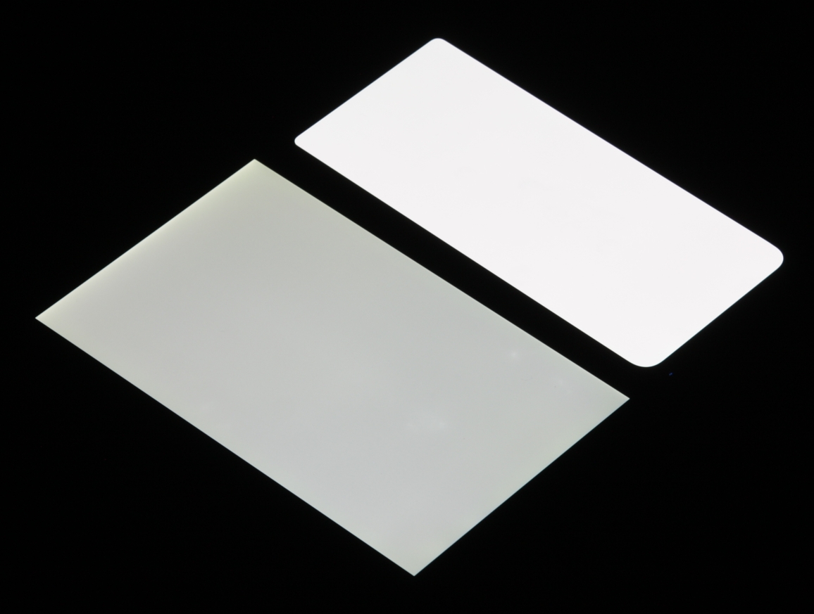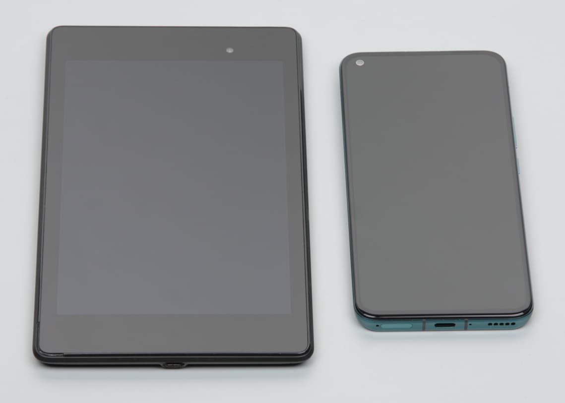 Лицевая поверхность экрана выполнена в виде стеклянной пластины с зеркально-гладкой поверхностью, устойчивой к появлению царапин. Судя по отражению объектов, антибликовые свойства экрана не хуже, чем у экрана Google Nexus 7 (2013) (далее просто Nexus 7). Для наглядности приведем фотографию, на которой в выключенных экранах отражается белая поверхность (слева — Nexus 7, справа — Honor 30, далее их можно различать по размеру):