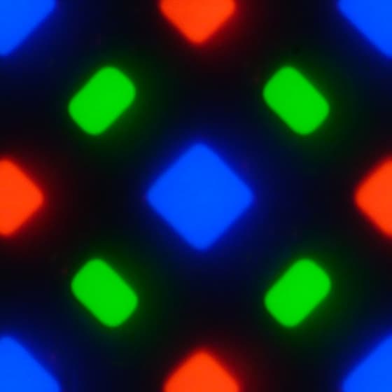 В этом экране используется матрица AMOLED — активная матрица на органических светодиодах. Полноцветное изображение создается с помощью субпикселей трех цветов — красного (R), зеленого (G) и синего (B), но красных и синих субпикселей в два раза меньше, что можно обозначить как RGBG. Это подтверждается фрагментом микрофотографии: