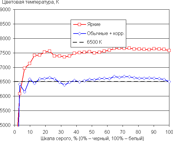 В случае профиля Обычные баланс оттенков на шкале серого хороший, так как на белом поле цветовая температура лишь немного выше стандартных 6500 К (порядка 6700 К), и отклонение от спектра абсолютно черного тела (ΔE) 3 единицы, что для потребительского устройства считается очень хорошим показателем.