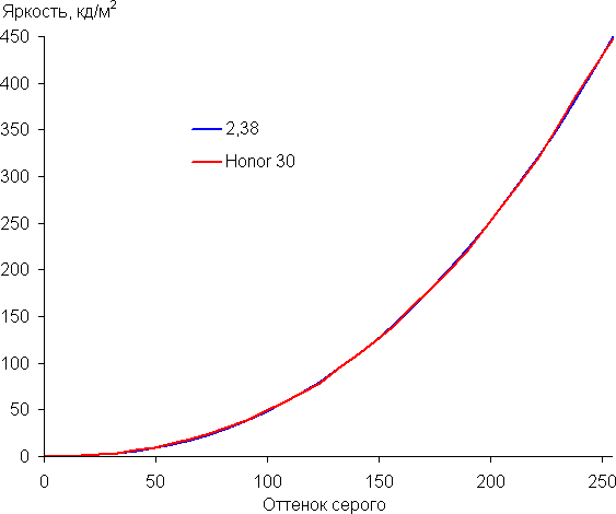 Напомним, что в случае OLED-экранов яркость фрагментов изображения динамично меняется в соответствии с характером выводимого изображения — чуть уменьшается для светлых в целом изображений. В итоге полученная зависимость яркости от оттенка (гамма-кривая), скорее всего, не соответствует гамма-кривой статичного изображения, так как измерения проводились при последовательном выводе оттенков серого почти на весь экран.