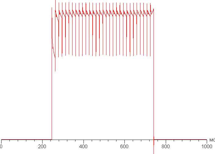 Переключение состояния элементов матрицы выполняется практически мгновенно, но на фронте включения может присутствовать ступенька шириной примерно 17 мс (что соответствует частоте обновления экрана в 60 Гц). Например, так выглядит зависимость яркости от времени при переходе от черного к белому и обратно: