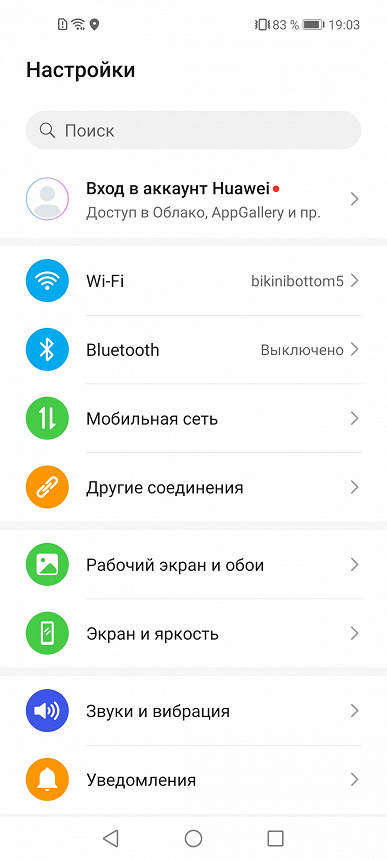 Для одиночной фронтальной камеры в матрице дисплея имеется круглое отверстие. При желании вырез можно скрыть за черной полосой, изменив оформление интерфейса. А вот такой полезный элемент, как светодиодный индикатор событий, у смартфона отсутствует.
