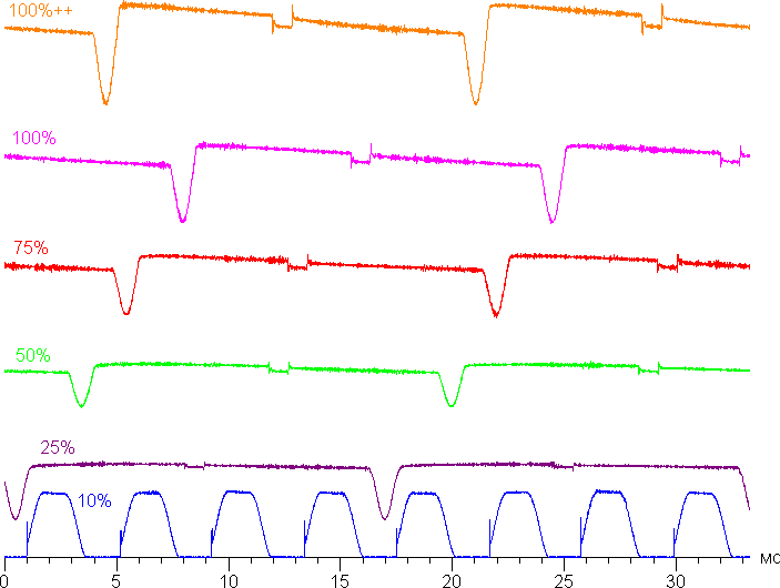 Только на низком уровне яркости появляется значимая модуляция с частотой примерно 240 Гц. На рисунке ниже приведены зависимости яркости (вертикальная ось) от времени (горизонтальная ось) для нескольких значений настройки яркости: