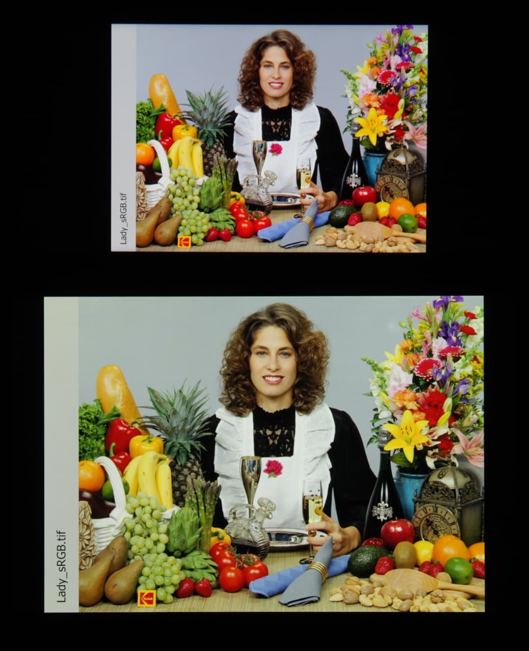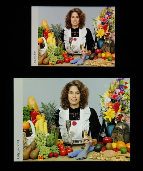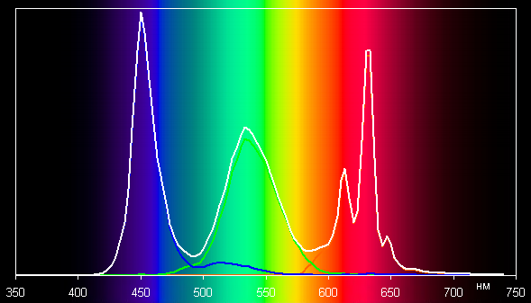 Спектры компонент достаточно хорошо разделены, что и обуславливает широкий цветовой охват. Для потребительского устройства широкий цветовой охват является недостатком, поскольку в итоге цвета изображений — рисунков, фотографий и фильмов, — ориентированных на пространство sRGB (а таких подавляющее большинство), имеют неестественную насыщенность. Особенно это заметно на узнаваемых оттенках, например на оттенках кожи. Результат приведен на фотографиях выше.