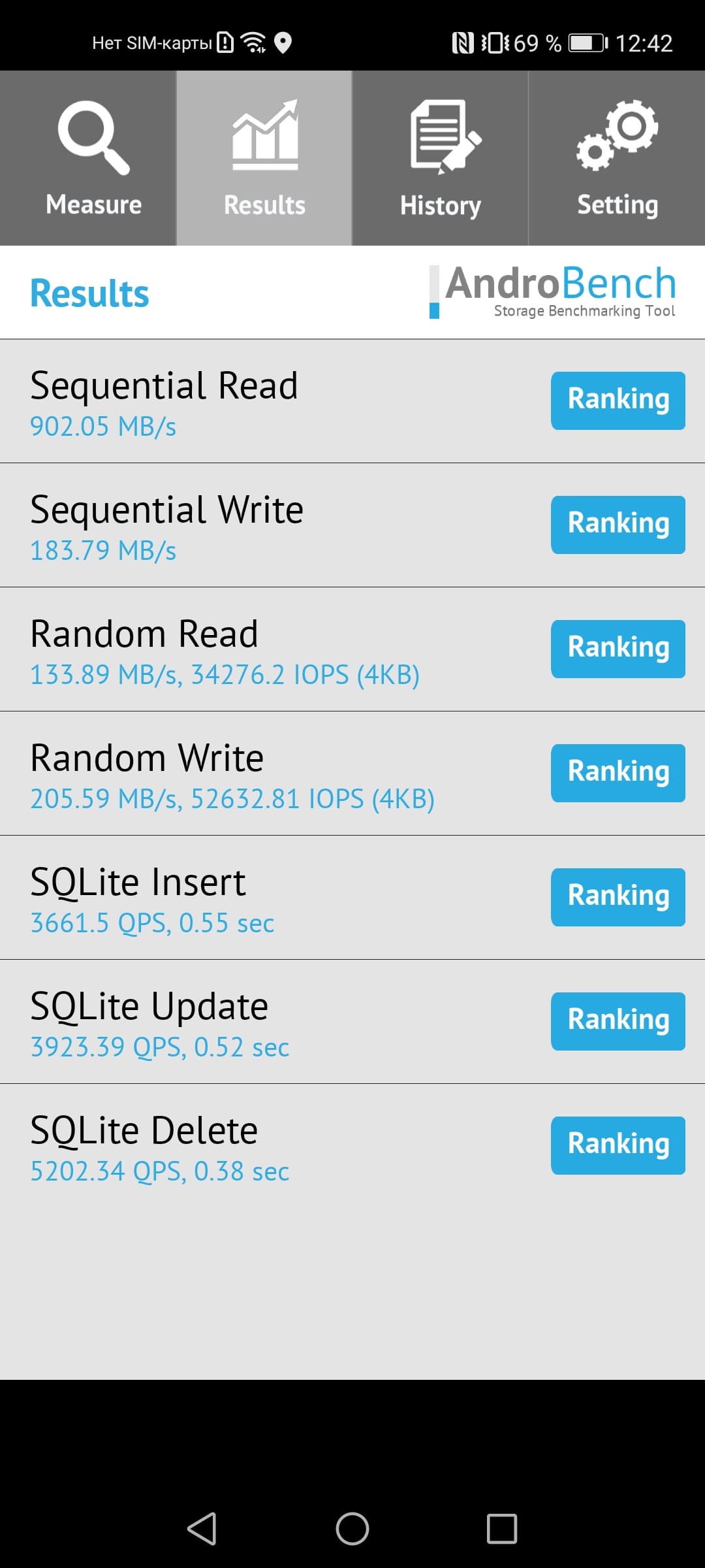 Результаты теста AndroBench на скорость работы с памятью: