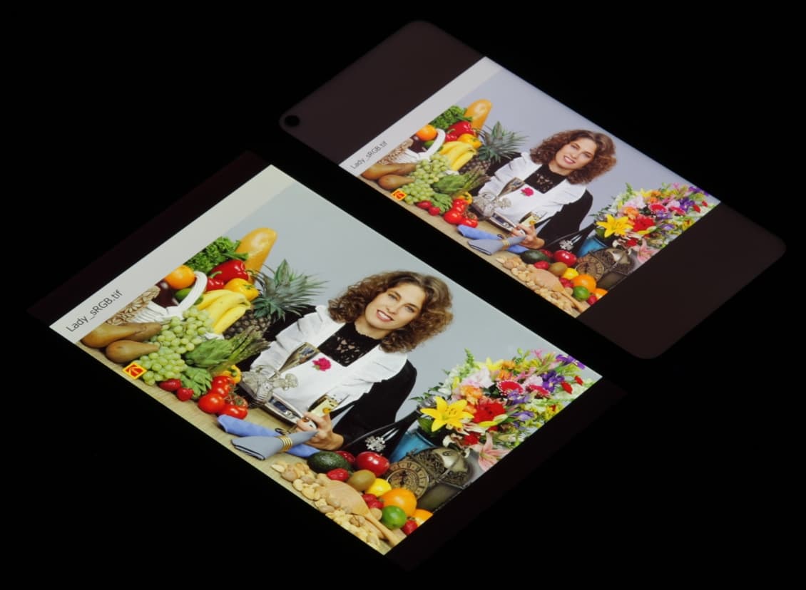 Экран имеет хорошие углы обзора без значительного сдвига цветов даже при больших отклонениях взгляда от перпендикуляра к экрану и без инвертирования оттенков. Для сравнения приведем фотографии, на которых на экраны Honor 30S и Nexus 7 выведены одинаковые изображения, при этом яркость экранов изначально установлена примерно на 200 кд/м², а цветовой баланс на фотоаппарате принудительно переключен на 6500 К.