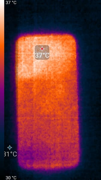 Нагрев больше в верхней части аппарата, что, видимо, соответствует расположению микросхемы SoC. По данным теплокамеры, максимальный нагрев составил 37 градусов (при температуре окружающего воздуха в 24 градуса), это не очень много.