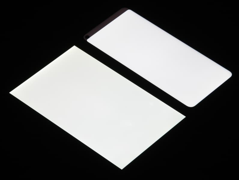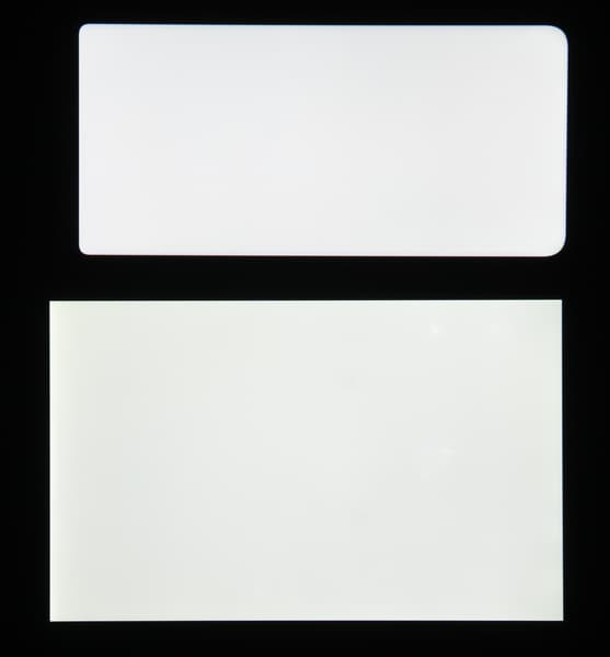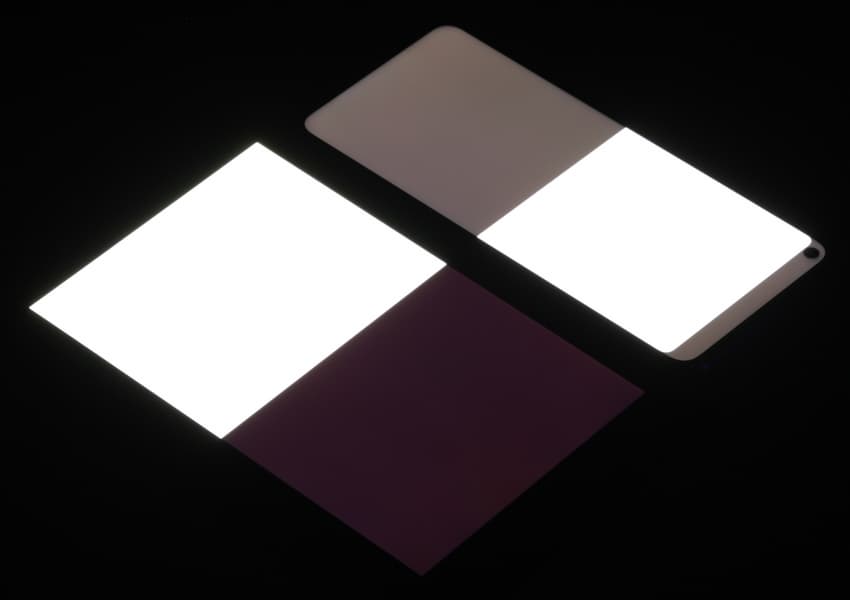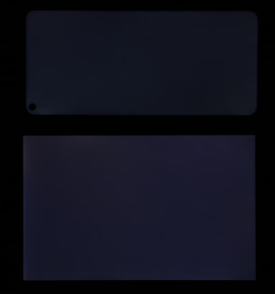 Яркость под углом у экранов уменьшилась (как минимум в 5 раз, исходя из разницы в выдержке), и уменьшилась примерно одинаково. Черное поле при отклонении по диагонали высветляется сильно и приобретает чуть красноватый оттенок. Фотографии ниже это демонстрируют (яркость белых участков в перпендикулярном плоскости экранов направлении одинаковая!):