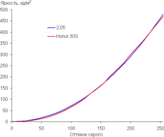 Цвета на экране Honor 30S явно перенасыщены, а цветовой баланс у экранов сильно различается — на экране смартфона серое поле почти голубое. Напомним, что фотография не может служить надежным источником сведений о качестве цветопередачи и приводится только для условной наглядной иллюстрации. Причина в том, что спектральная чувствительность матрицы фотоаппарата неточно совпадает с этой характеристикой человеческого зрения.