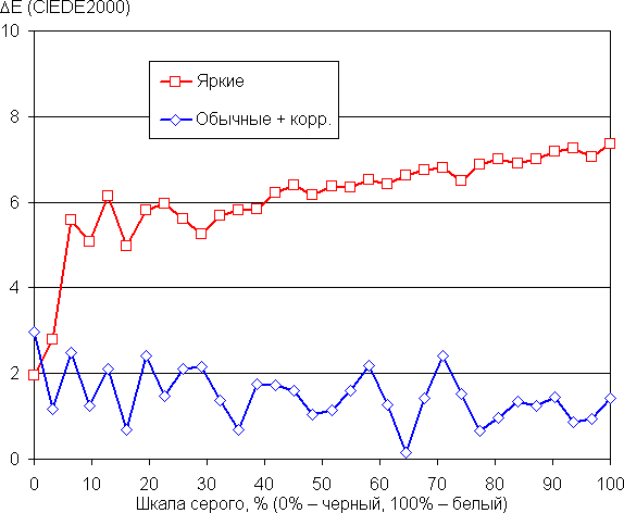На графиках ниже кривые Яркие соответствуют результатам без какой-либо коррекции цветового баланса (профиль Яркие), а кривые Обычные + корр. — данным, полученным после выбора профиля Обычные и ручной коррекции цветового баланса (точка на круге коррекции — как на снимке выше). (Самые темные области шкалы серого можно не учитывать, так как там баланс цветов не имеет большого значения, да и погрешность измерений цветовых характеристик на низкой яркости большая.)